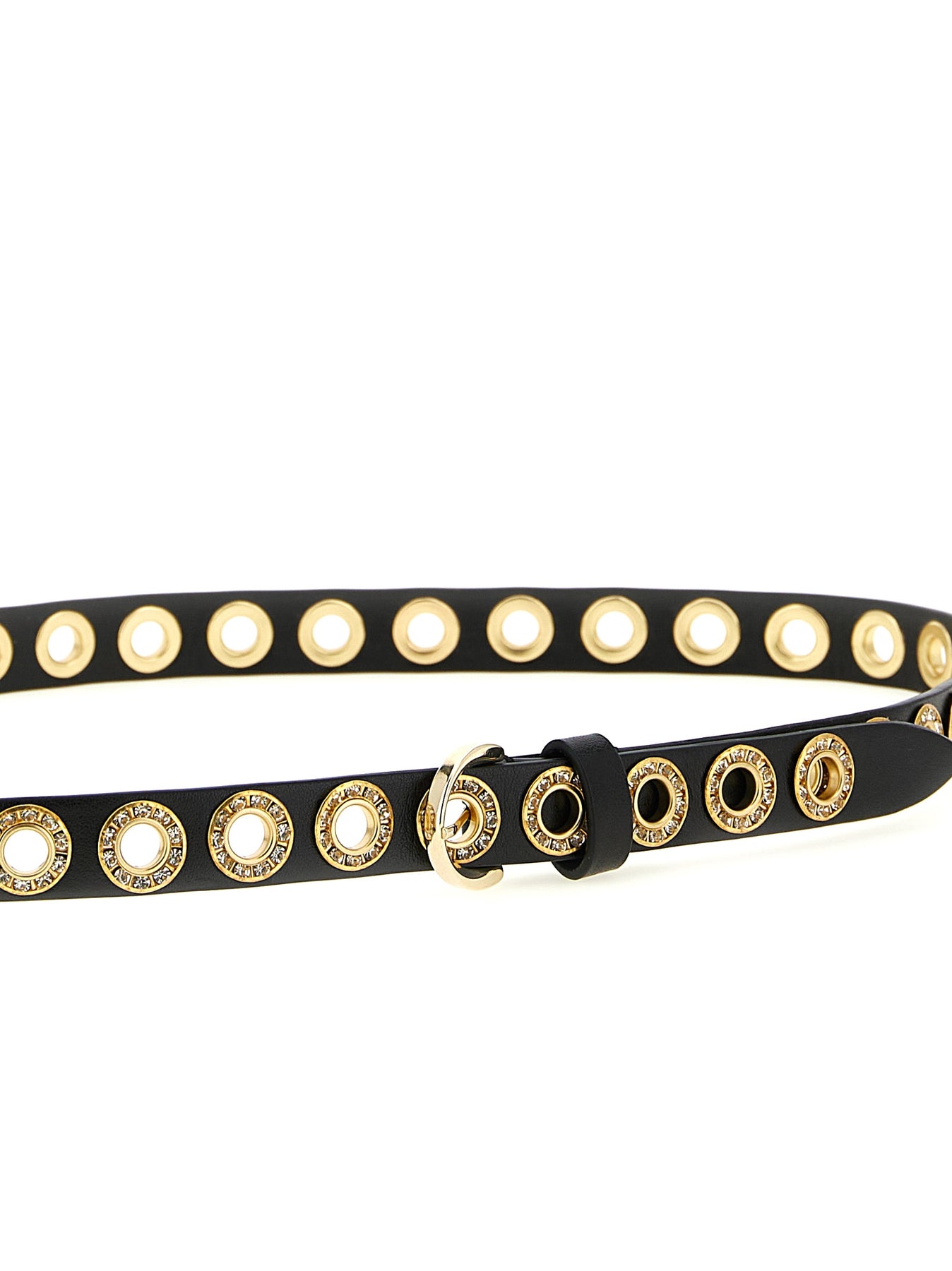 Leather-effect fabric belt with cut-out metal studs and crystals, and metal buckle.