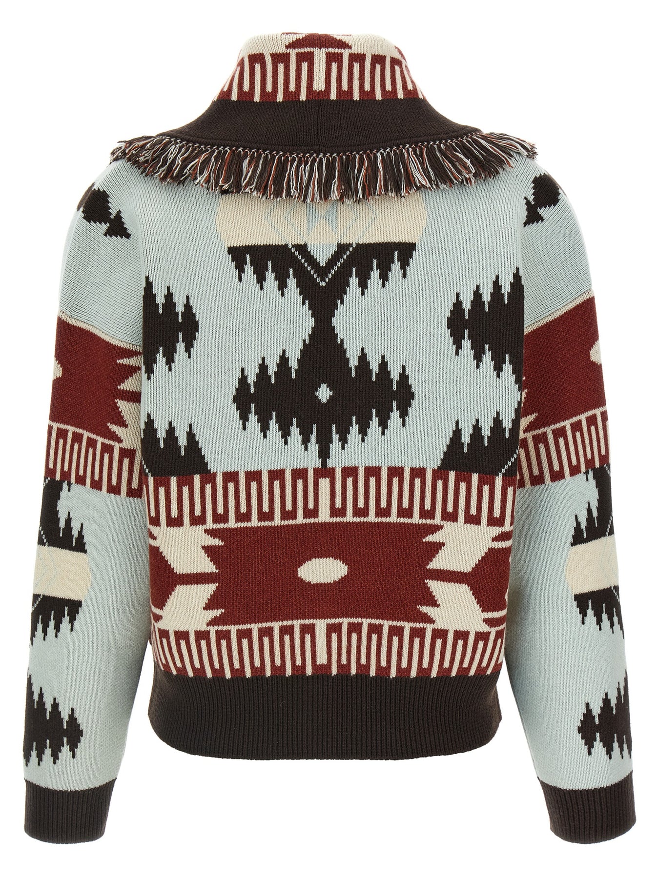 Cashmere and virgin wool cardi-bomber jacket with double jacquard 'Alanui' pattern, bomber cardigan, shawl collar with fringes, front button closure, long sleeves with cuffs and dropped shoulder.