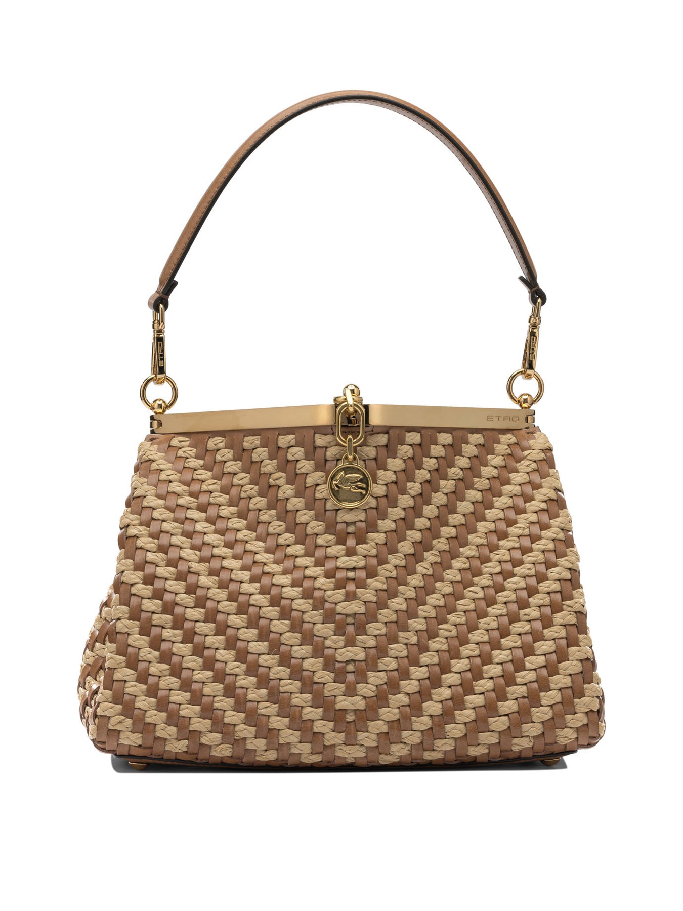 Etro small "Vela" shoulder bag, made of woven raffia and leather. The construction features a rigid structure and a compact silhouette. Metal closure with Pegasus coin detail obtained by coining. The handle is removable for different levels of portability. Metal accessories are finished with gold treatment that completes the functional configuration of the product. || - Woven raffia and leather - Metal clasp with minted Pegasus coin - Removable handle for shoulder carryability - Metal accessories with gold finish