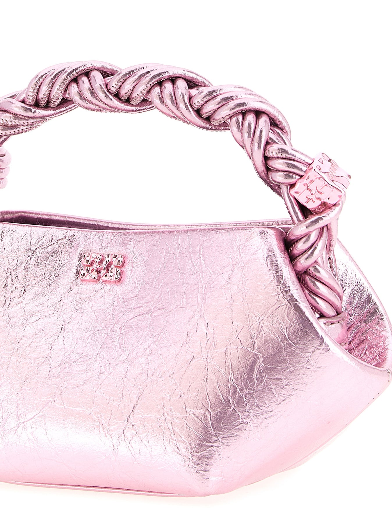 Bou' mini handbag in craquelé metallic leather-effect fabric, tone-on-tone metallic 'Ganni Butterfly' logo on the front, inner magnetic closure, fixed braided handle with tone-on-tone metal knot and nut, adjustable and removable shoulder strap, and back embossed logo. SUSTAINABLE: product made from recycled materials.