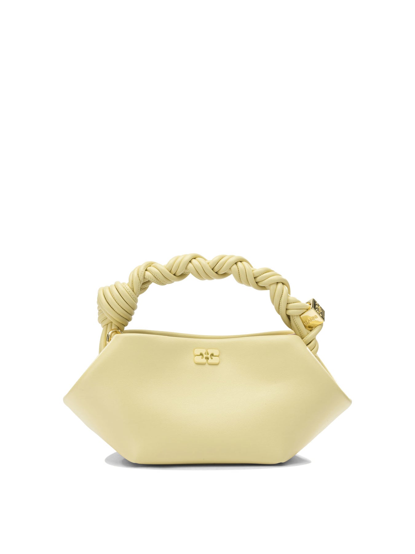 Ganni small "Bou" handbag, made with compact construction in mixed materials including recycled leather, polyester and polyurethane. The defined silhouette features a single interior compartment, braided top handle with twisted knot and metal details engraved with Ganni Butterfly logo. Interior magnetic closure and adjustable, removable shoulder strap that also allows for crossbody wear. The butterfly logo appears tone-on-tone on the front, with embossed lettering on the back. || - Braided top handle with knot - Metallic Ganni butterfly logo on front - Metal dice with logo engraving - Removable and adjustable shoulder strap - Interior magnetic closure - Interior flat pocket for cards - Eco-friendly product