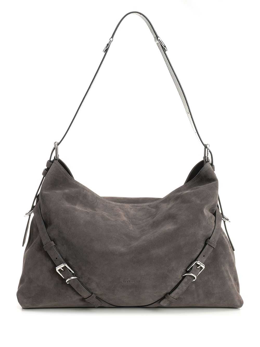 Voyou large suede shoulder bag with buckles, adjustable shoulder strap, internal zip pocket.