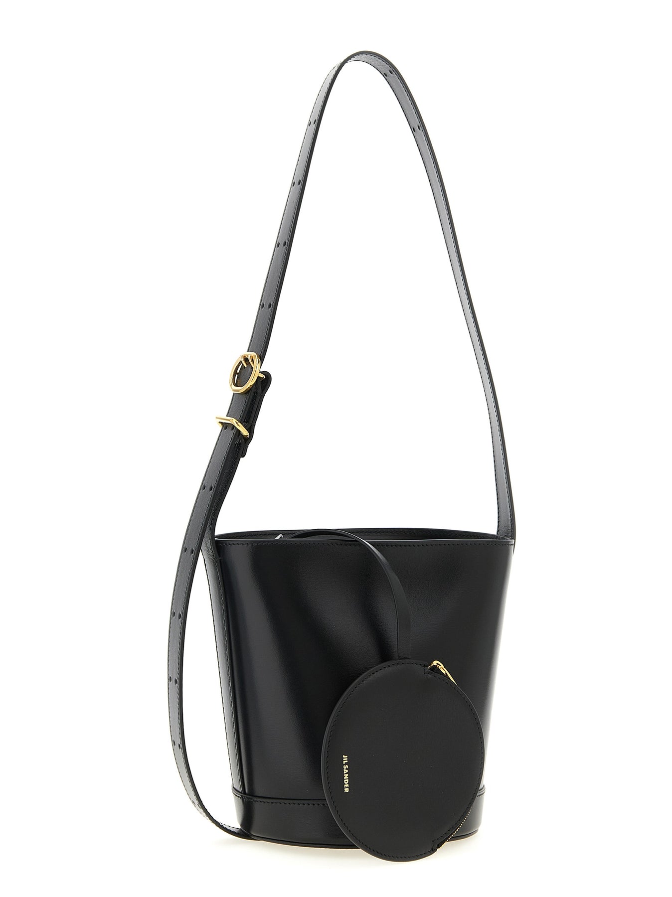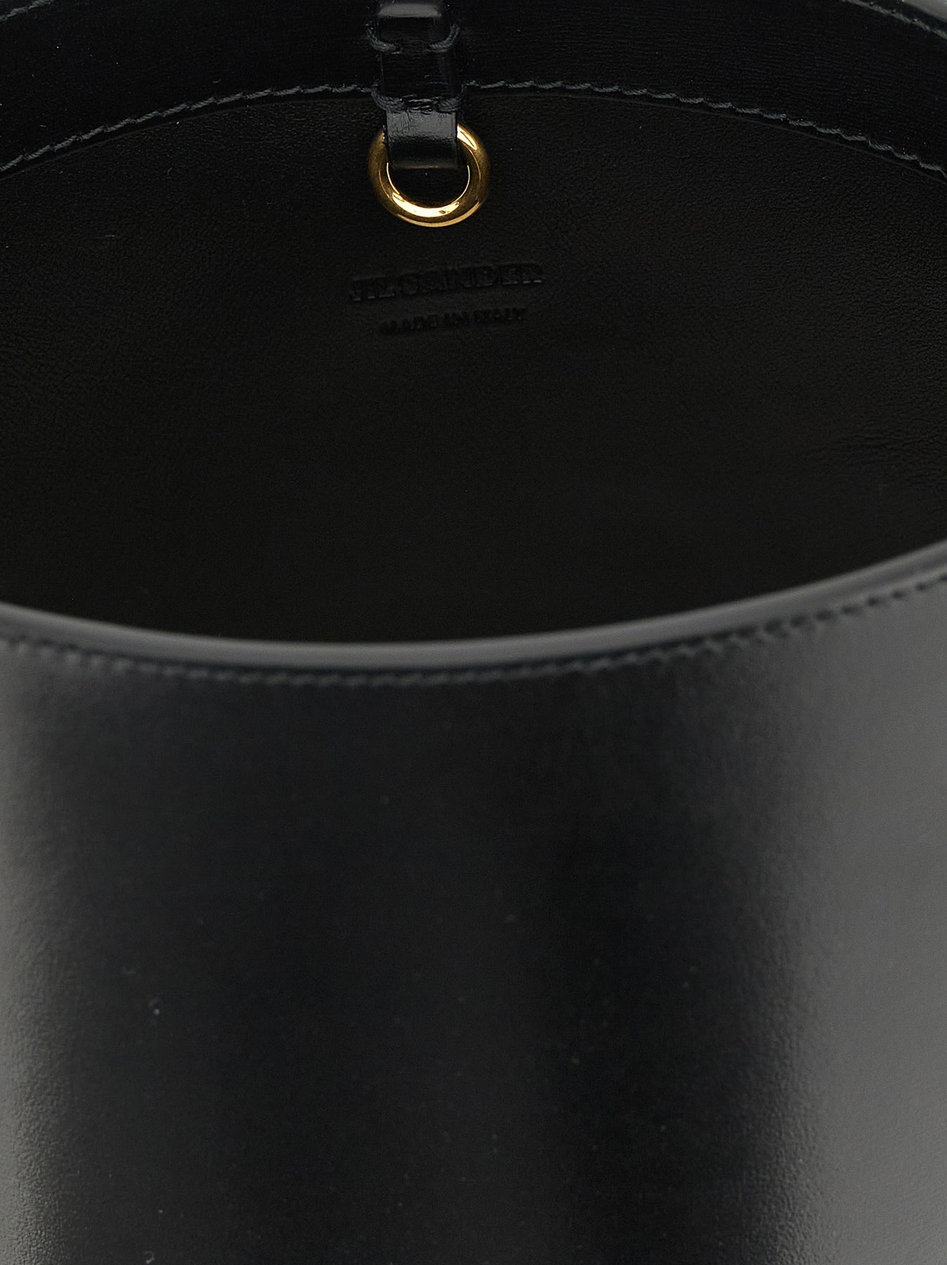 Leather shoulder bag, front embossed logo, inner hook closure, adjustable shoulder strap with 'Cannolo' buckle, rigid base, nappa lining, removable clutch.