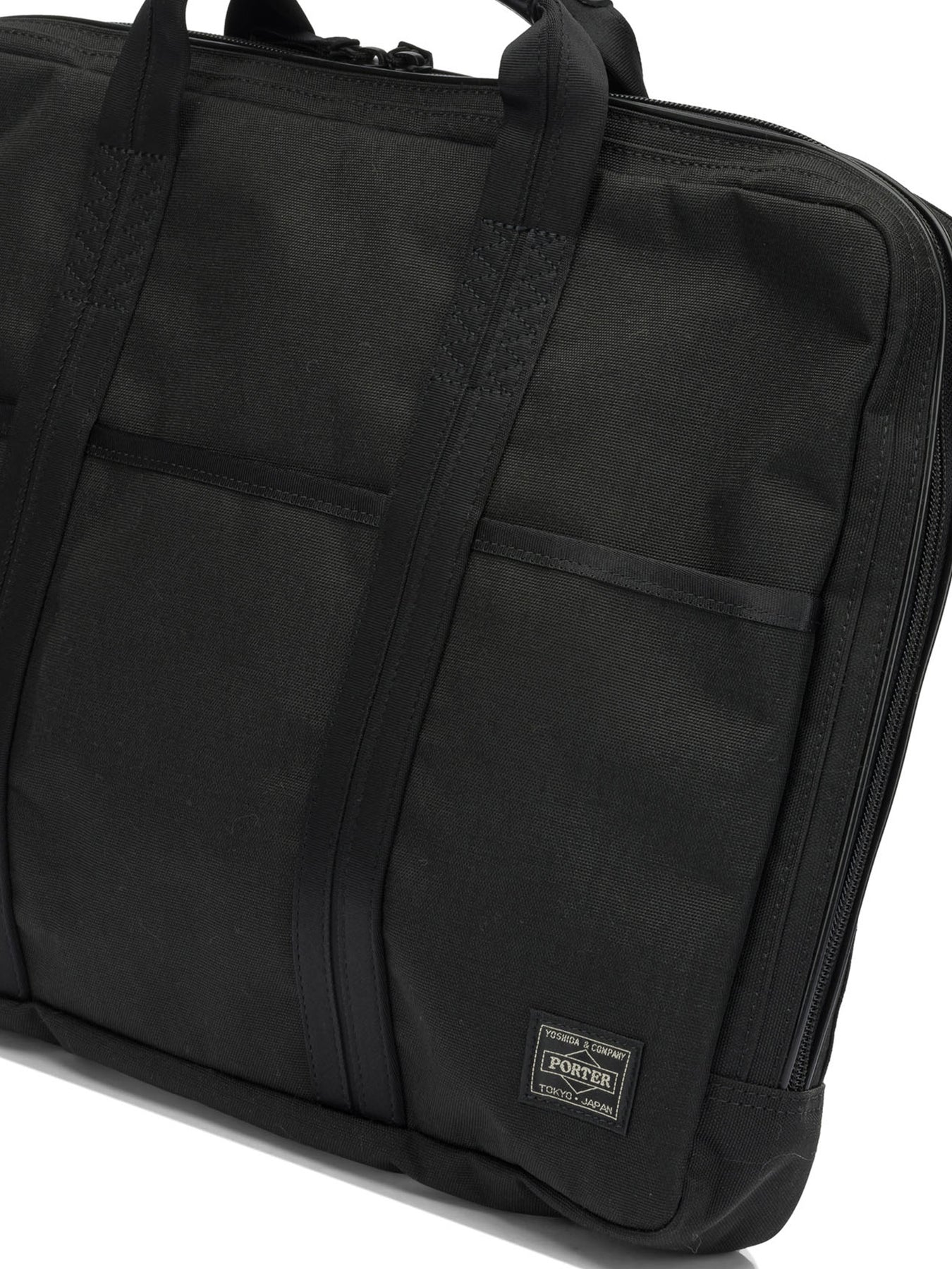 Porter-Yoshida & Co large "Hibrid 2Way" hand bag, made of Cordura nylon, a water and wear-resistant material. The structure is flexible and reinforced, featuring top handles, back shoulder straps and a removable and adjustable shoulder strap. The rectangular silhouette incorporates a central compartment with a double-slider closure, organized interior compartments and front pockets accessible by snaps, zippers and Velcro. || - Main material: waterproof Cordura nylon - Hand, shoulder and backpack carrying system - Interior divided into compartments, also suitable for laptop - Front pockets with snap, zipper and Velcro closure - Removable and adjustable shoulder strap - Hidden rear shoulder straps - Total capacity: approximately 16 liters - Main closure with double-slider zipper