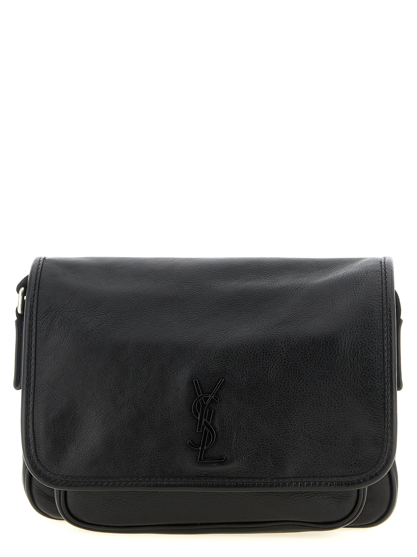 Small 'Niki' hammered leather crossbody bag in messenger style, magnetic flap closure with tone-on-tone metal 'Cassandre' logo on the front, back pocket, leather lining, adjustable tape shoulder strap.