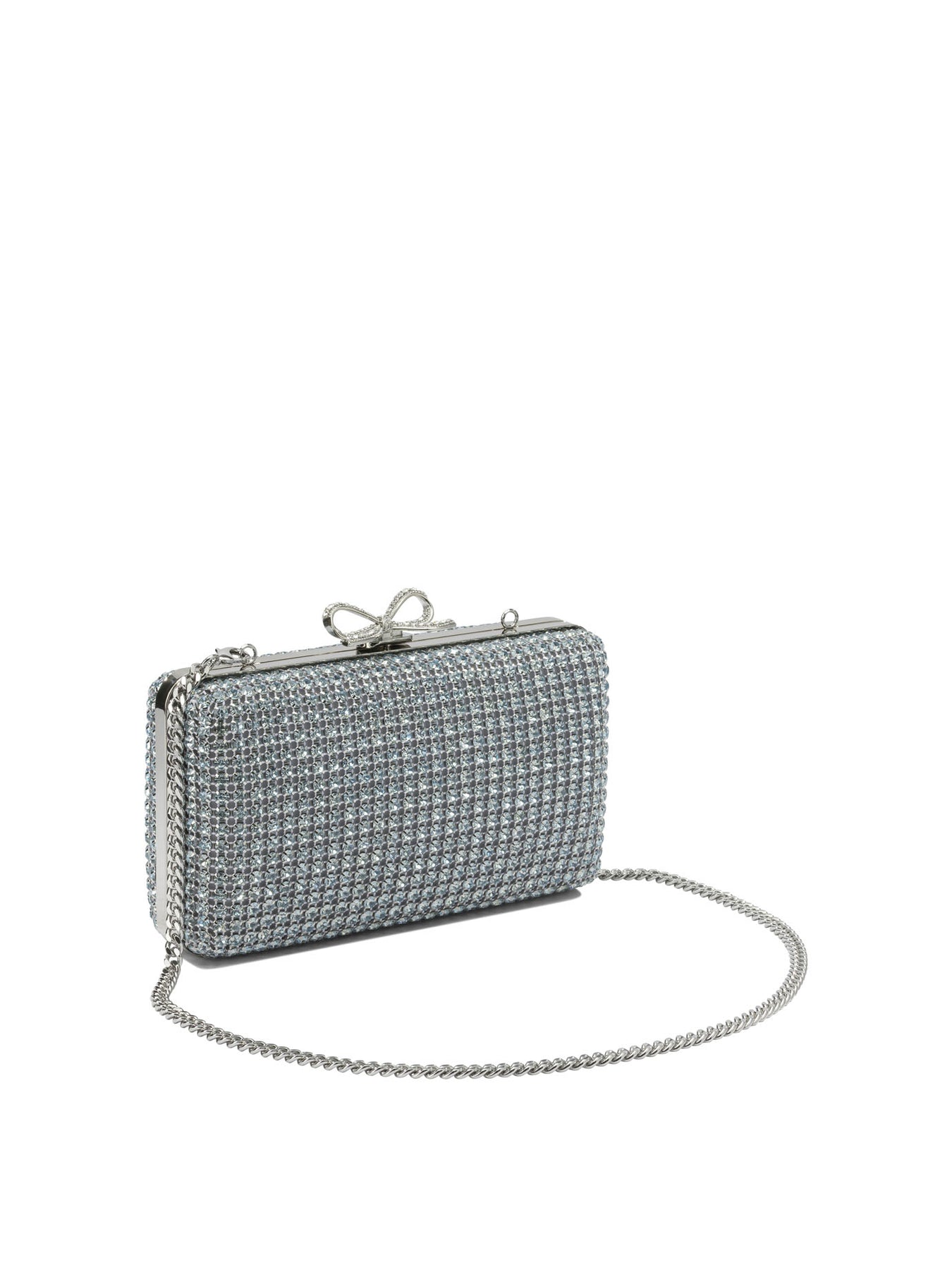 Self-portrait crystal clutch, made with a crystal mesh exterior and semi-rigid construction. The geometric silhouette features clean lines and a compact structure. The uniform surface houses a central detail consisting of an applied crystal bow motif. The design is complemented by a removable chain strap and buckle closure, which is integrated at the top to ensure practicality of use. || - Crystal mesh exterior - Applied crystal bow motif - Buckle top closure - Removable chain shoulder strap