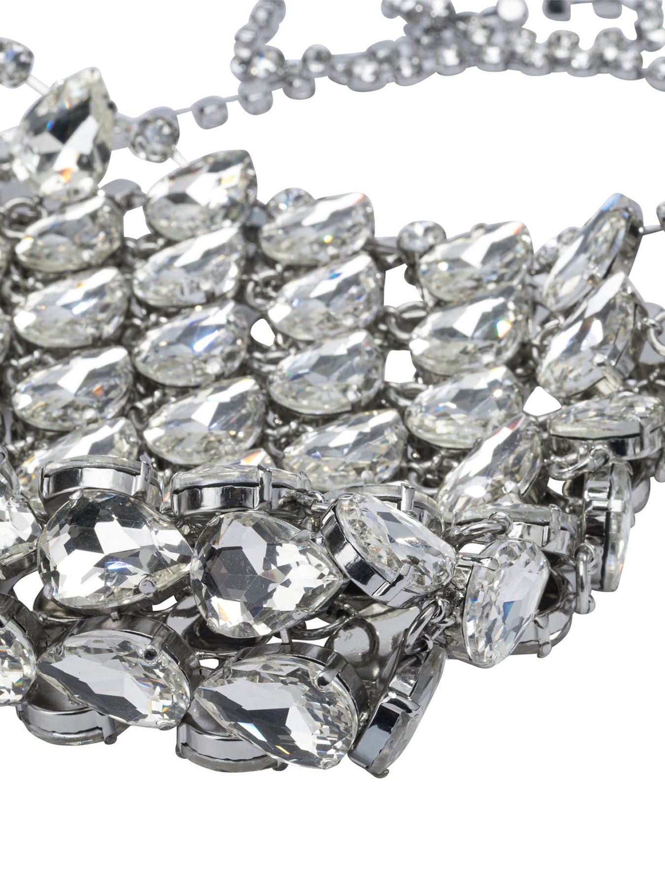 Self-portrait small crossbody bag crafted with a crystal mesh exterior and soft construction. The compact structure features an essential silhouette defined by a removable metal shoulder chain. The interior features a drawstring closure for convenient storage. Functional elements are integrated linearly, with care toward materials and finishing details. || - Exterior made of crystal mesh - Interior with drawstring closure - Removable metal shoulder chain - Polyester lining