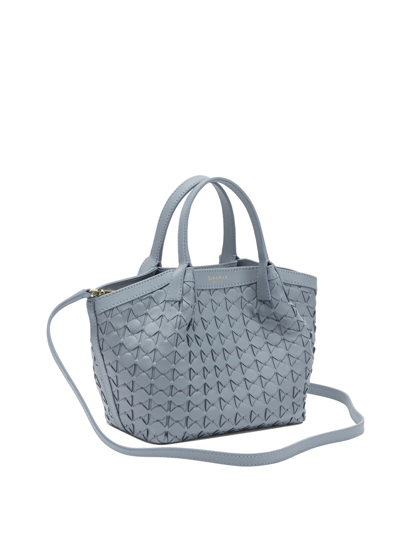 Serapian "Secret" mini handbag made of woven lambskin nappa leather and Italian calfskin inserts. The compact silhouette is supported by a rigid structure, with a double top handle and magnetic snap closure. The interior is divided into three compartments, a central zippered one and two side compartments with a flat pocket and a zippered pocket. Equipped with an adjustable and removable leather shoulder strap. || - Double top handle - Magnetic snap closure - Adjustable and removable leather shoulder strap - Three interior compartments, including a central zippered one - Two inside pockets: one flat, one zippered - Interior microfiber lining - Made with Serapian Mosaic workmanship - Composition: woven lambskin nappa leather, Italian calfskin inserts