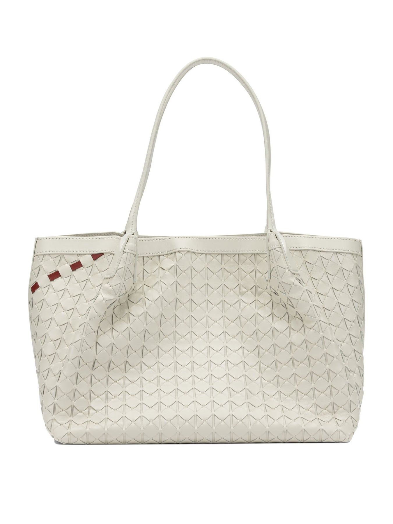 Serapian small "Secret" shoulder bag made of hand-woven lambskin nappa leather with Italian calfskin inserts. The soft structure develops into a compact silhouette with double handles and a rounded line. The body of the bag is worked according to the brand's signature Mosaic technique, which combines strips of nappa leather into a continuous-looking graphic pattern. Magnetic snap closure integrated into the top opening. || - Double leather-covered handle - Magnetic top snap closure - Three separate interior compartments - Center compartment with zippered closure - Interior flat pocket and zippered pocket - Contrasting microfiber lining - Metallics with palladium finish - Handcrafted intrecciato weave, exclusive Serapian workmanship