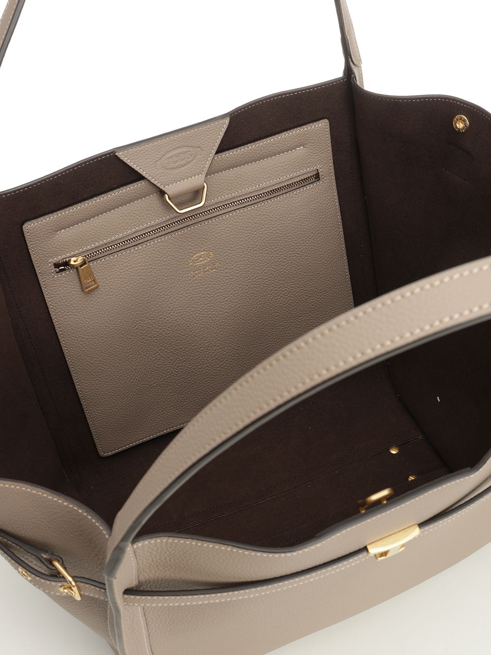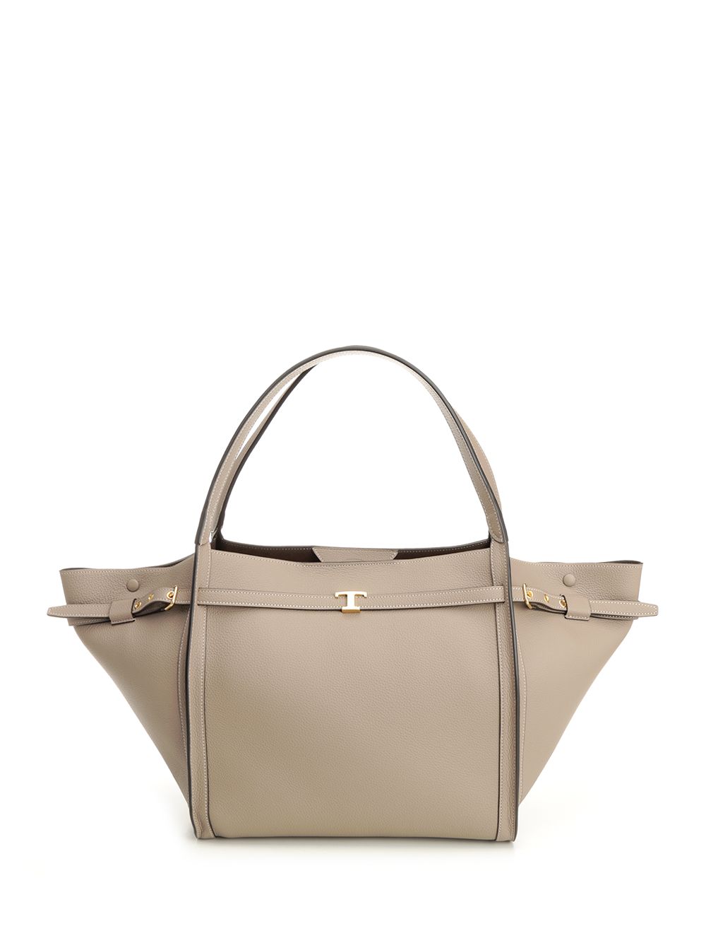 Crafted from soft calfskin, this tote bag features a strap along the top edge with the iconic Timeless T accessory. Featuring two flat handles, it also has an adjustable and removable shoulder strap. It closes with a hook and covered snap closure. Interior zip pocket.