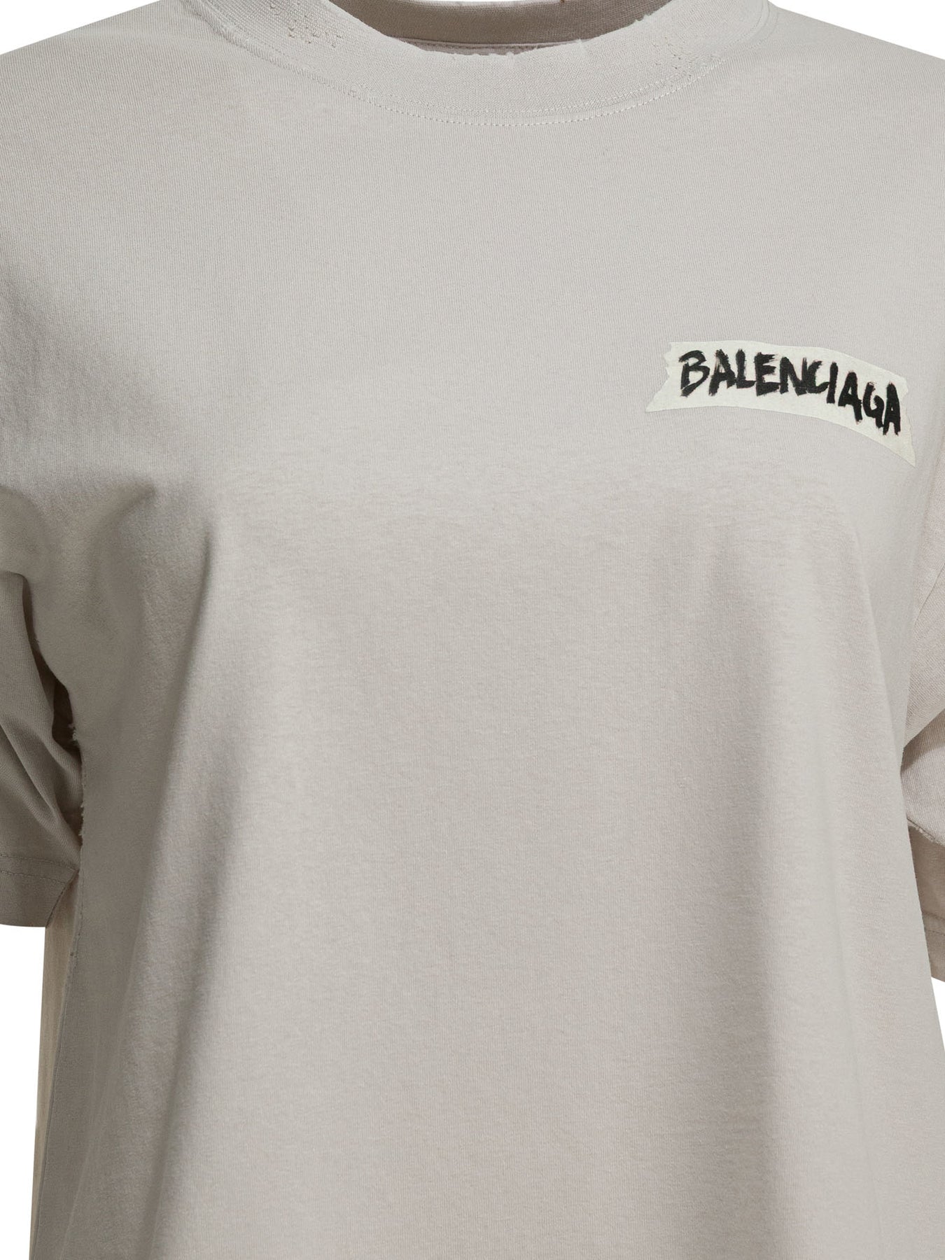 Balenciaga "Masking Tape" T-shirt made of dry jersey, featuring a faded and washed-out effect surface. The garment features a straight silhouette and soft structure, ribbed crew neck and short sleeves. On the front and back is a masking tape themed printed pattern, integrated into the fabric texture. || - Printed logo motif - Short sleeves - Ribbed crew neck - Dry jersey - Masking tape motif printed front and back - Faded and washed out effect - Regular fit