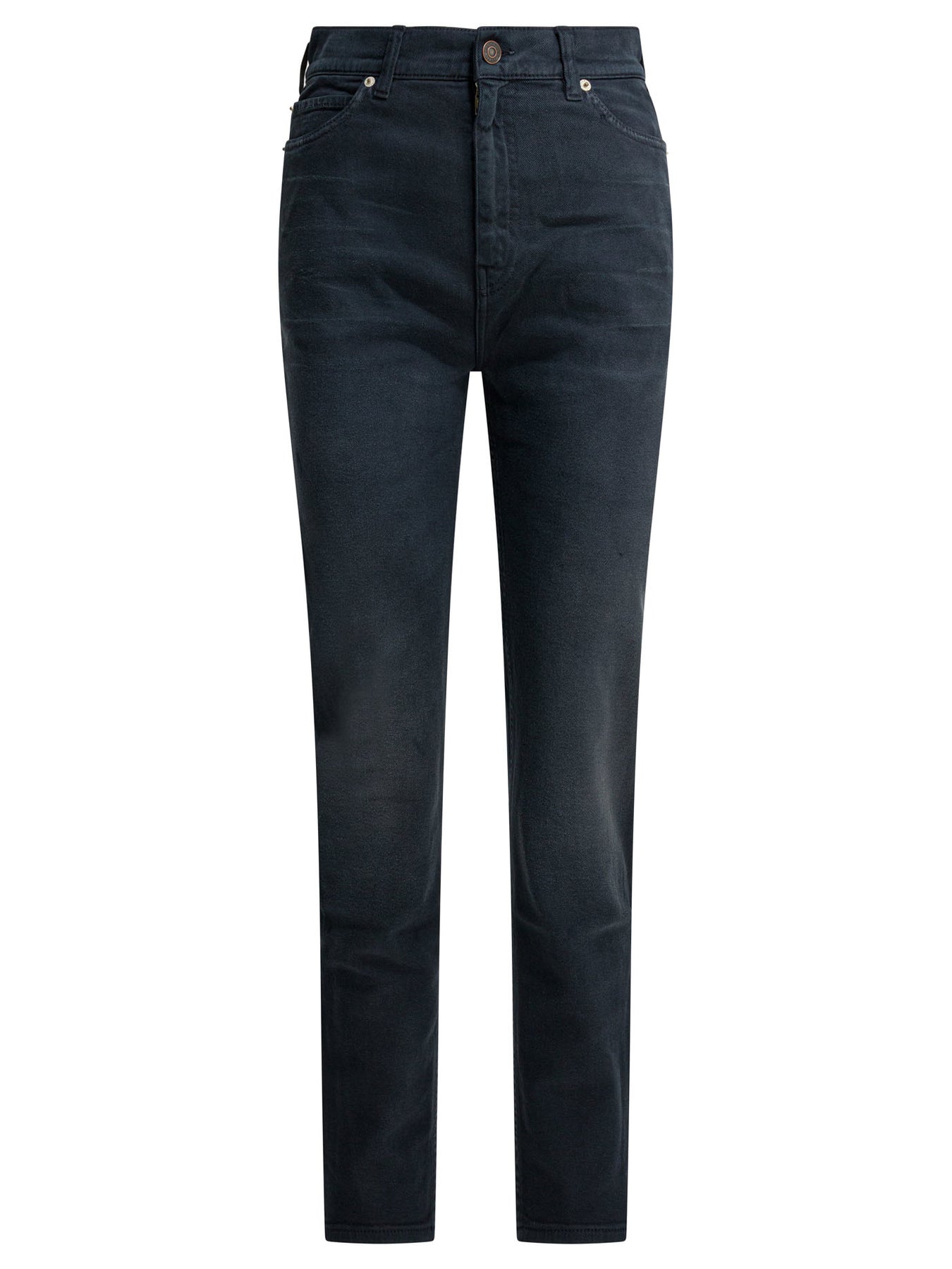 Balenciaga skinny jeans made from cotton denim. High-waisted design with a fitted silhouette features a covered front zipper closure. Five-pocket structure with five belt loops. Functional inserts identify the garment through the Balenciaga Jeans patch applied on the back. The treatment features a washed and worn effect surface. || - Solid color - High waist - Covered zipper closure - Five pockets - Five belt loops - Balenciaga Jeans patch on the back - Washed and worn effect - Slim fit