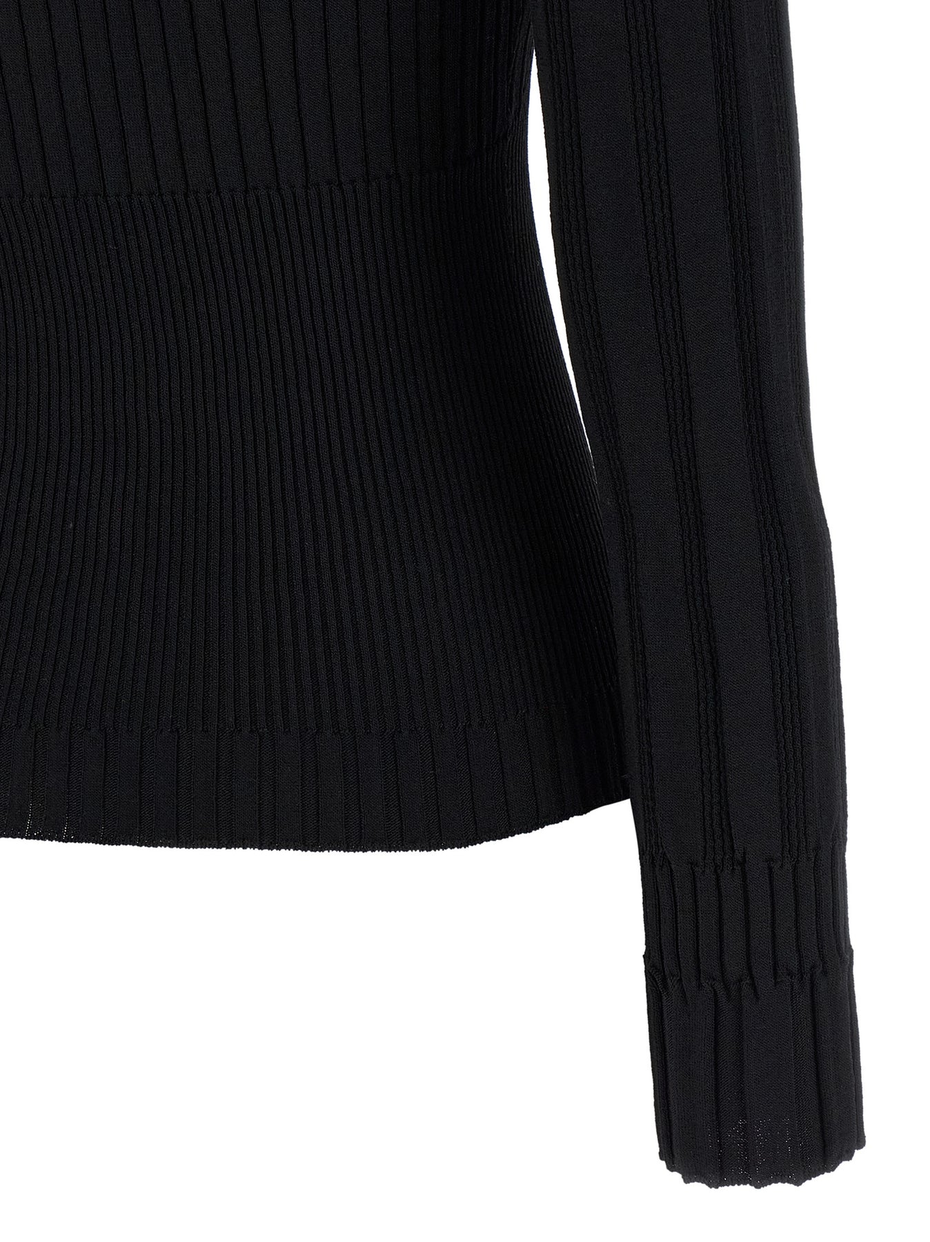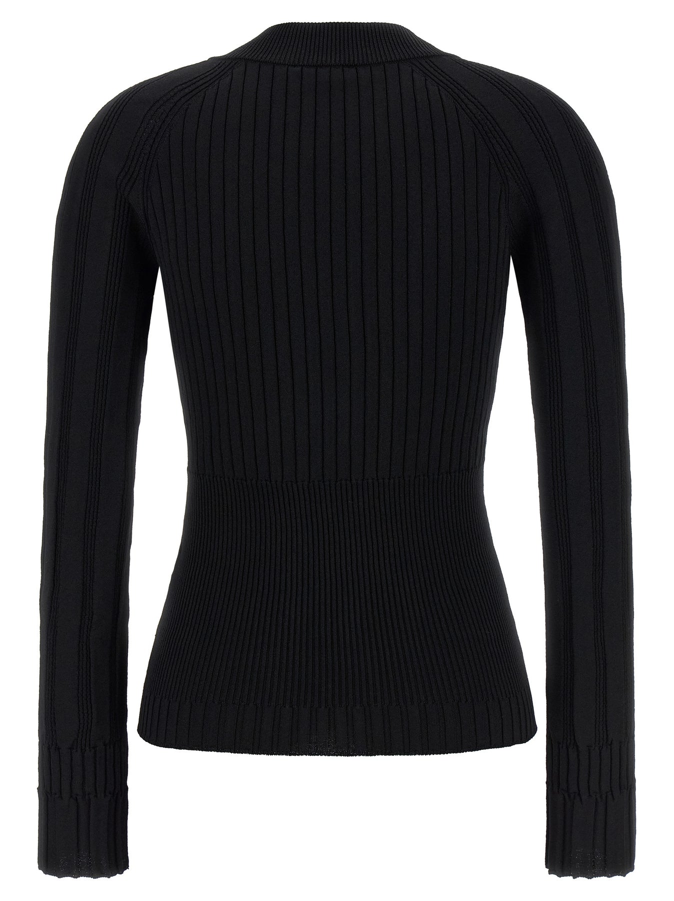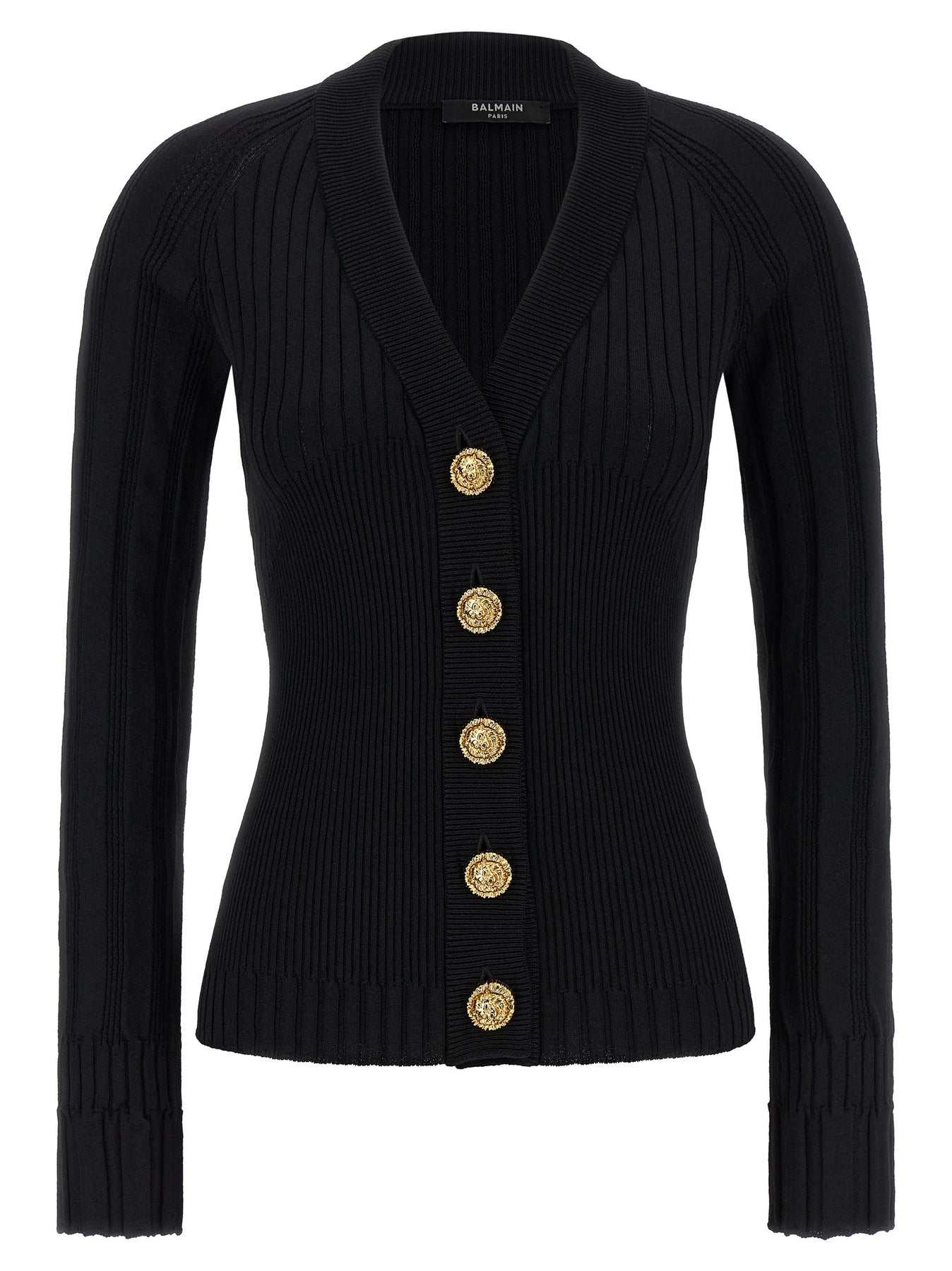 Ribbed stretch viscose knit cardigan, V-neck, front 'Testa di leone' button detail, long cuffed sleeves.