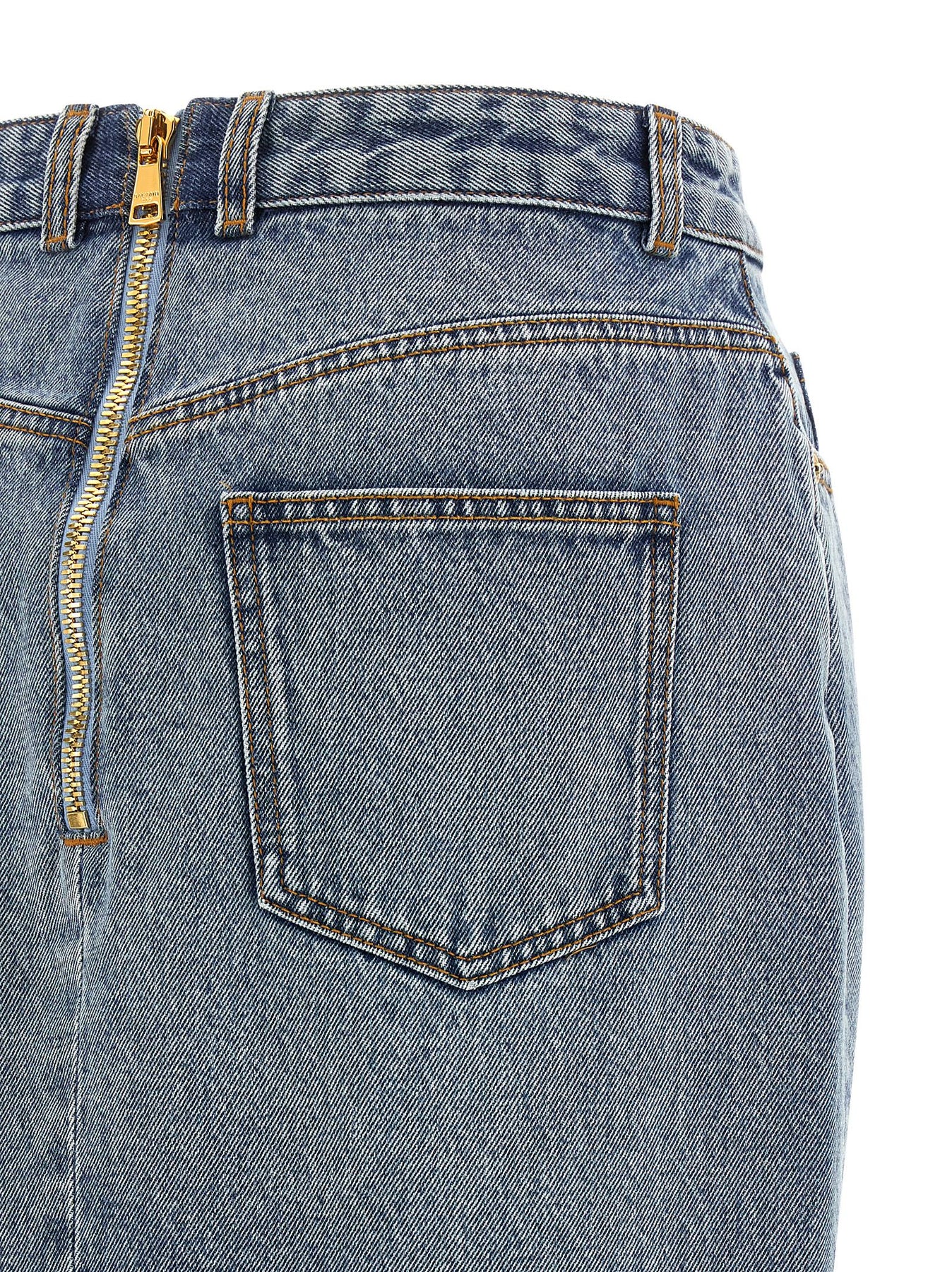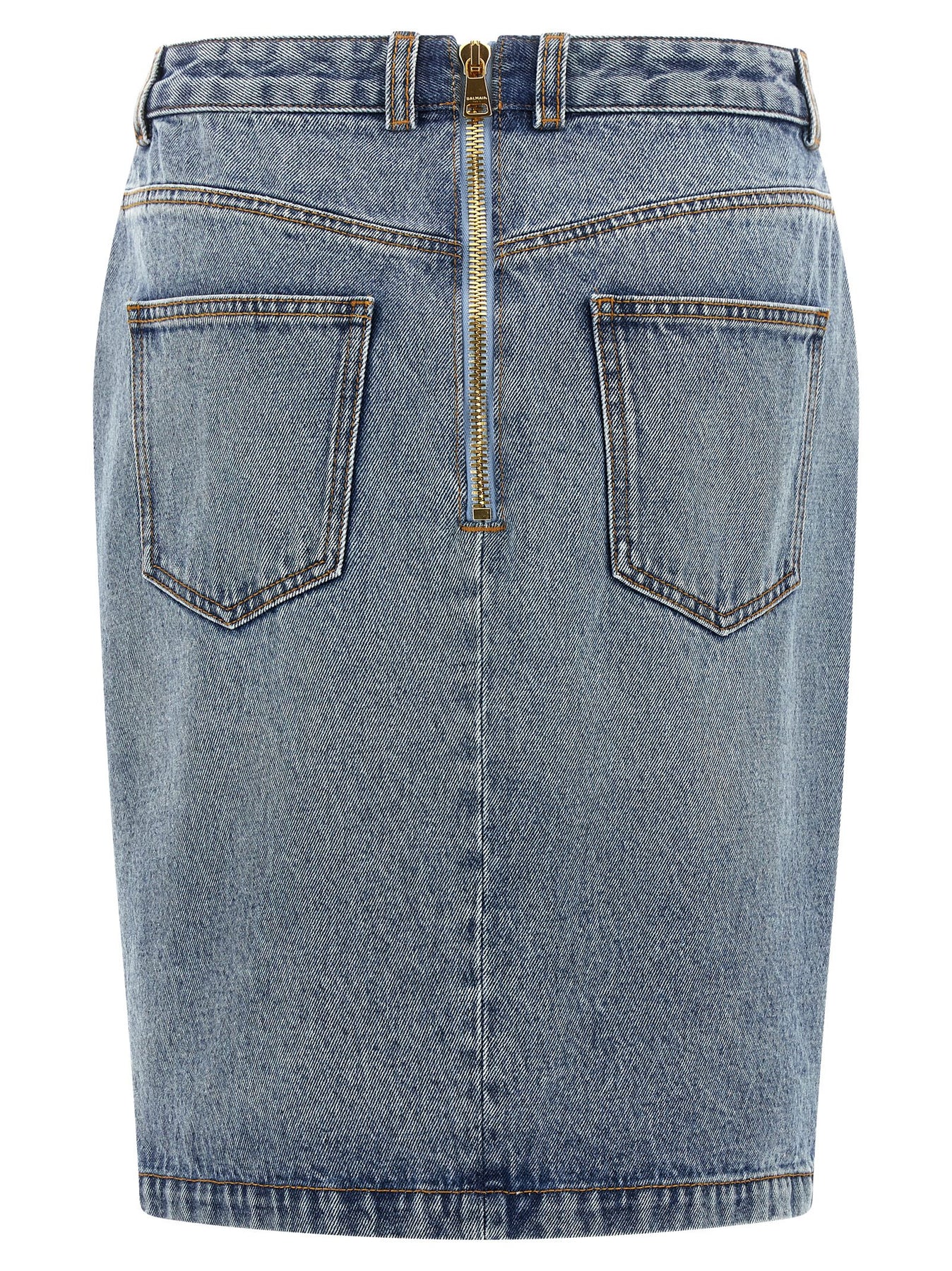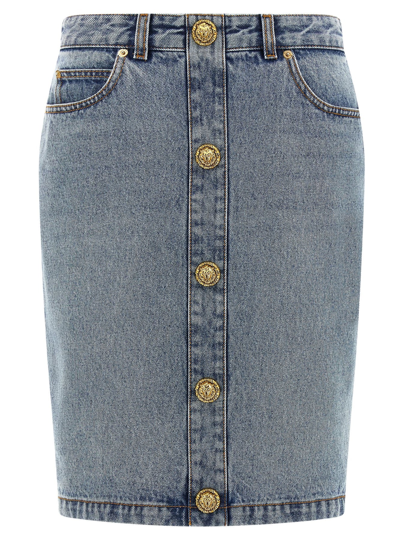 Midi skirt in washed cotton denim with contrasting stitching, pencil design, metal 'Testa di leone' buttons on the front, back zip closure, five pockets.