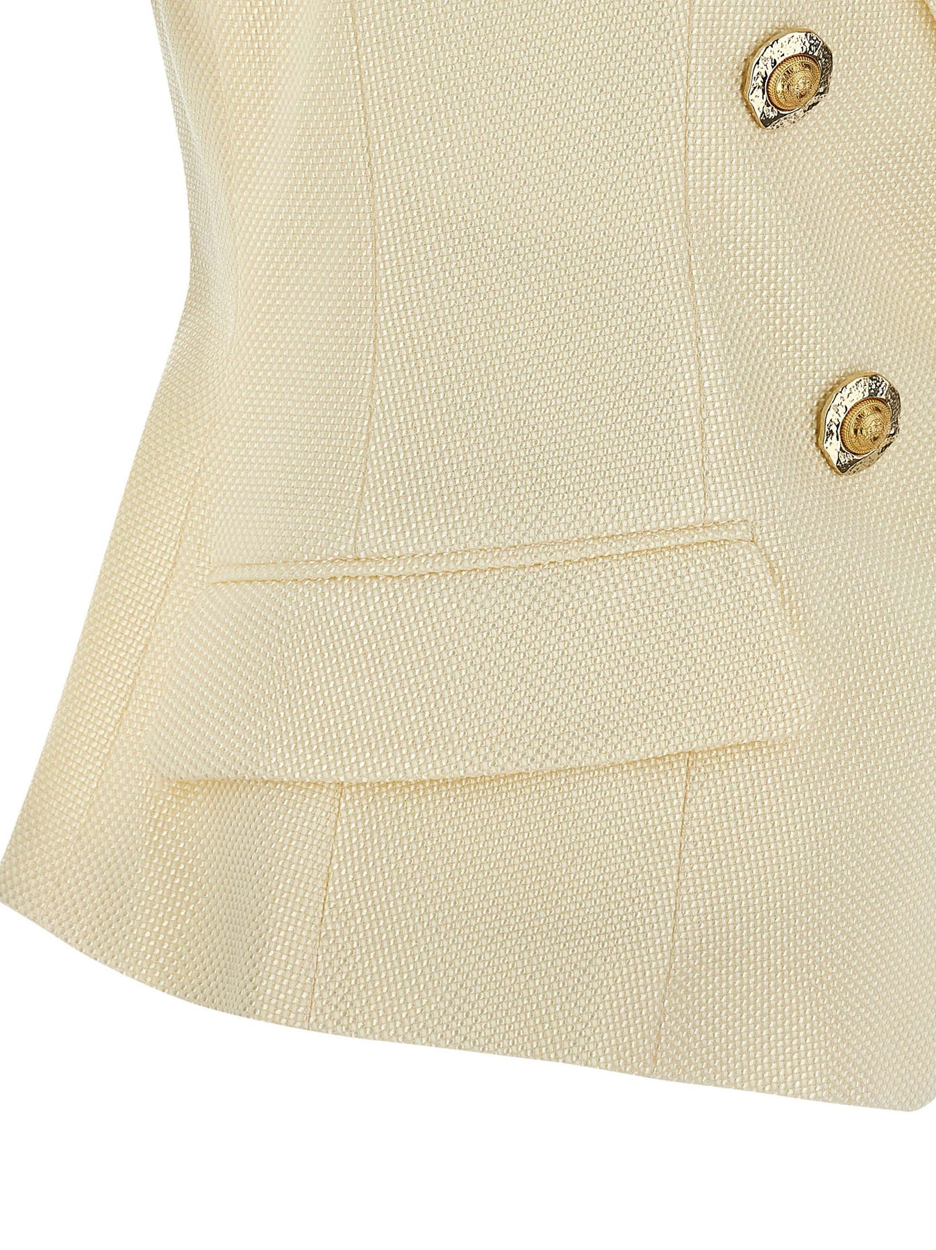 Double-breasted trompe l'oeil vest in natté with decorative metal 'Gold and Gold Coin' buttons on the front, peak lapels, maxi padded shoulders, flap pockets, pocket, back zip closure, asymmetric hem, serge lining.