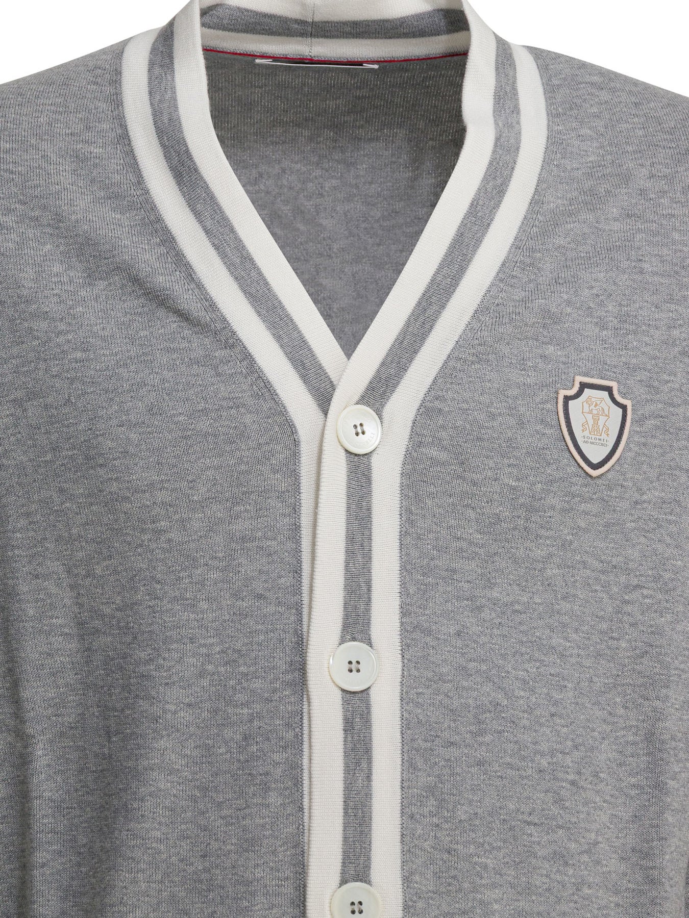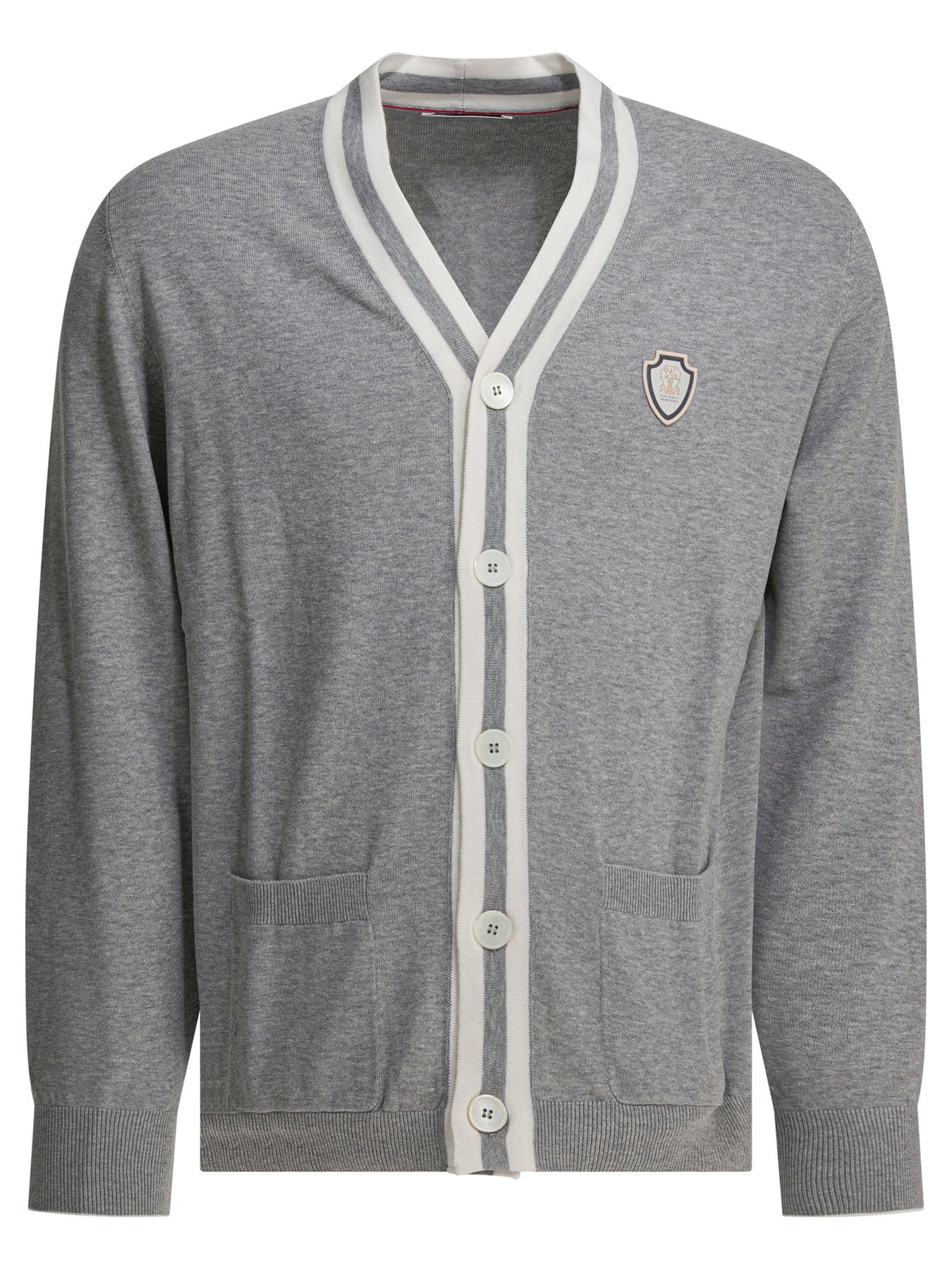Brunello Cucinelli logo cotton cardigan made from pure cotton knit. The construction features a straight silhouette with a rib-knit V-neck. Front closure with contrasting profile mother-of-pearl buttons and two front patch pockets. Structure with rib knit bottom hem and cuffs, a yarn characterized by lightness and softness to the touch. Heraldic logo is embroidered on the chest. || - Heraldic logo applied on the chest - Long sleeves - Mother-of-pearl button closure - Rib-knit V-neckline - Low patch pockets - Rib knit cuffs and bottom hem - Regular fit