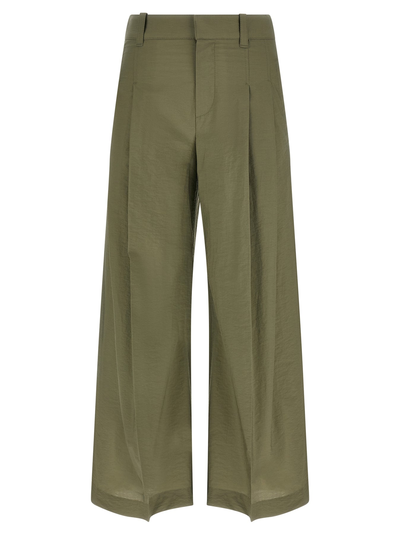 Cotton blend trousers, double pleats, wide leg, stretched pleat, front zip and button closure, pockets, back Monile detail.
