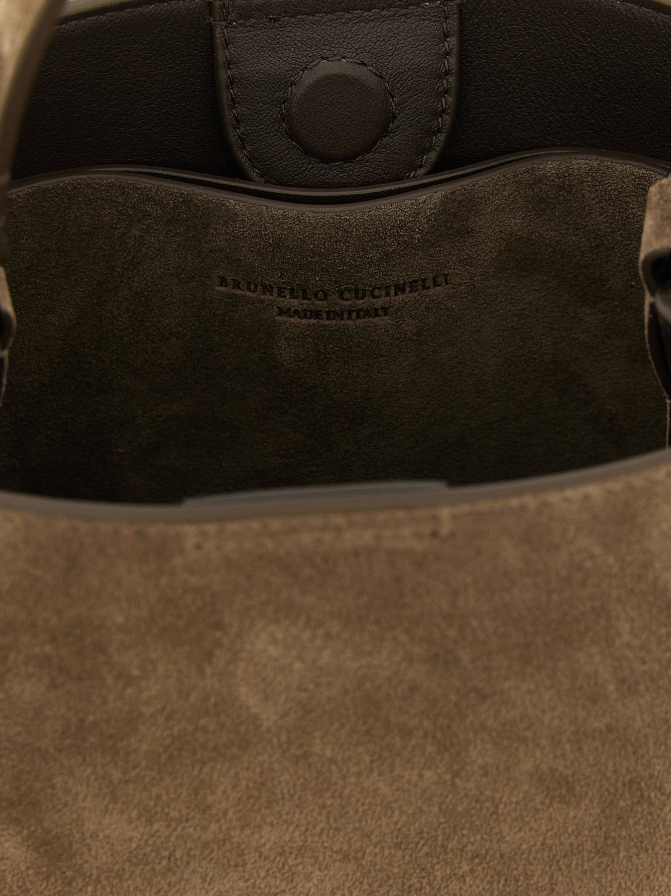 Small 'Essence' suede handbag with tone-on-tone smooth leather details, side 'Precious Bands' embroidered in Monile, front embossed logo, fixed handle, magnetic closure, rigid base with metal feet, adjustable and removable shoulder strap.