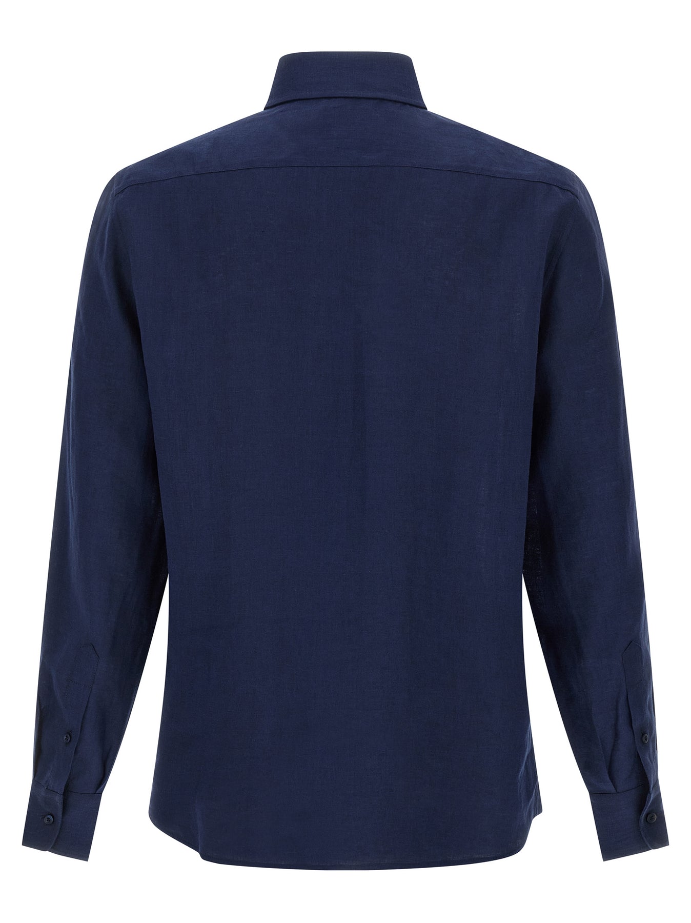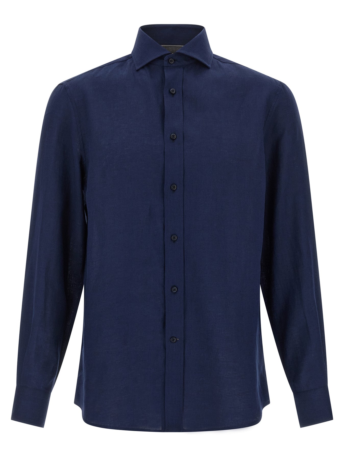 Linen shirt with French collar, front button closure, long cuffed sleeves.