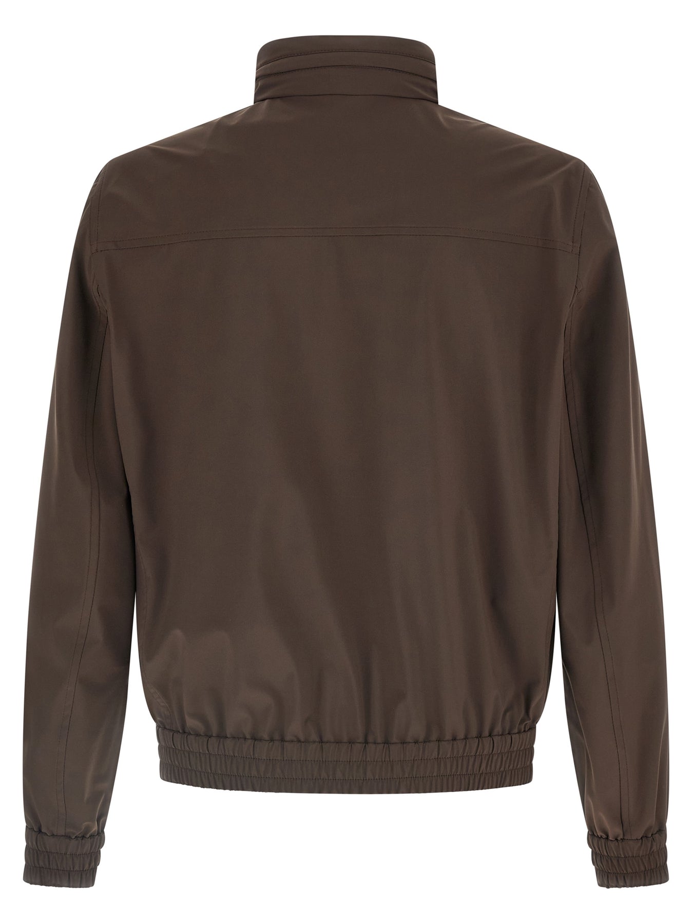 Water-repellent and breathable membrane nylon jacket, unlined, standing collar with removable hood, front zip closure, pockets, long sleeves with elastic cuffs, elastic hem.