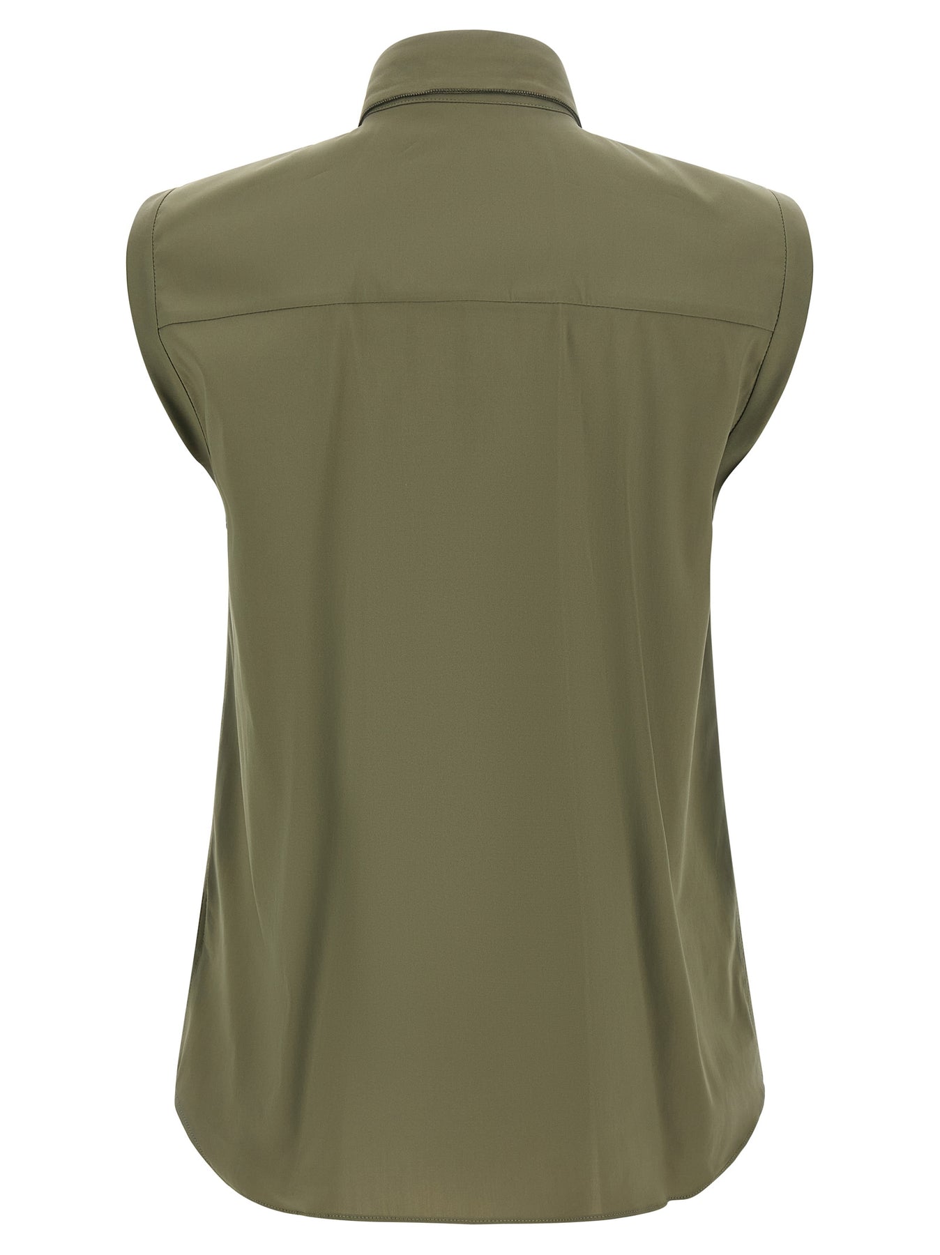 Stretch cotton poplin shirt, pointed collar with Monile 'Shiny Trim' piping, concealed front button closure, sleeveless, rounded hem.