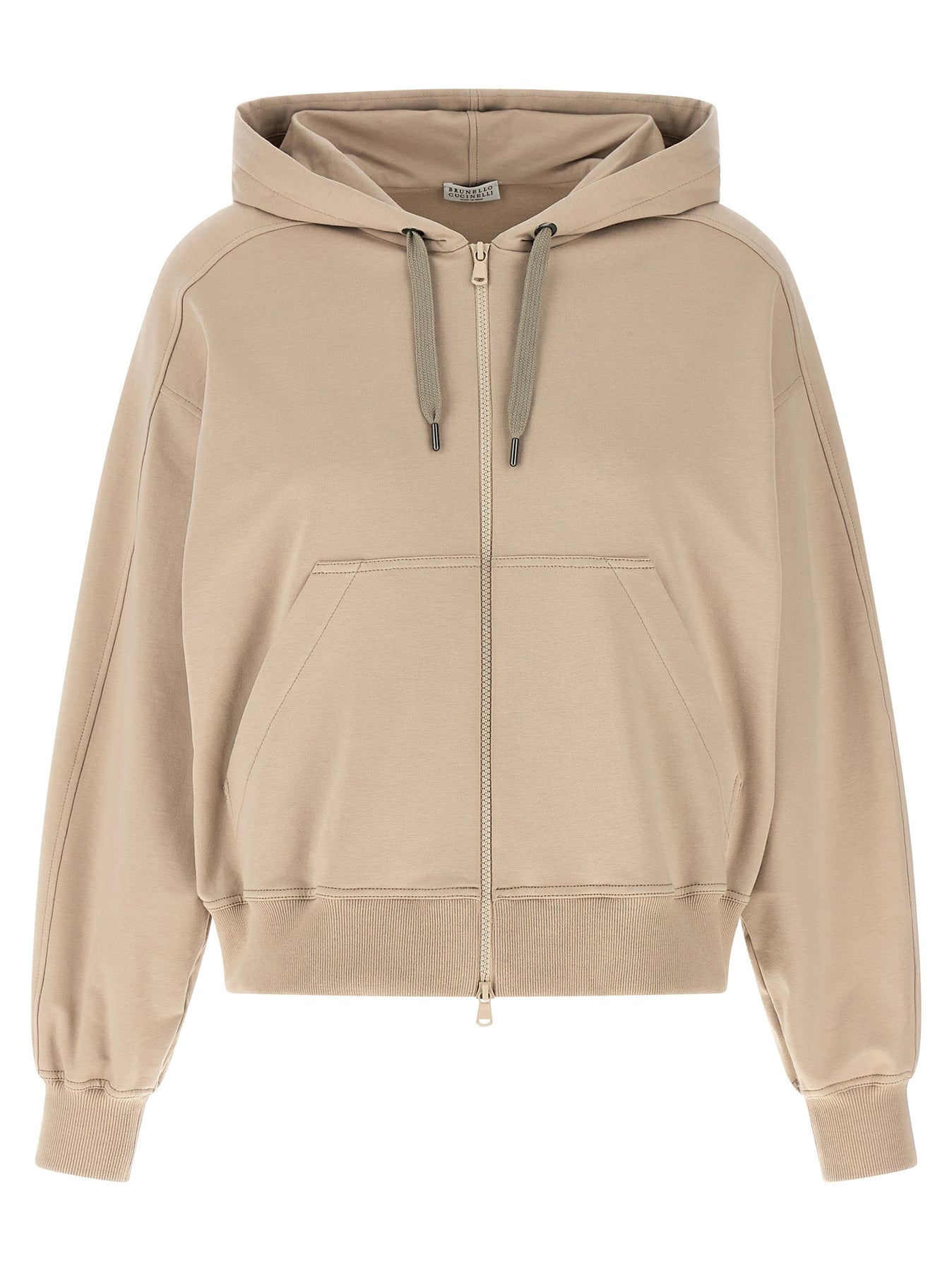 Lightweight stretch cotton hoodie with tone-on-tone 'Solomei AD MCCCXCI' print on the back, front zip closure, pockets, long sleeves with cuffs and dropped shoulders.