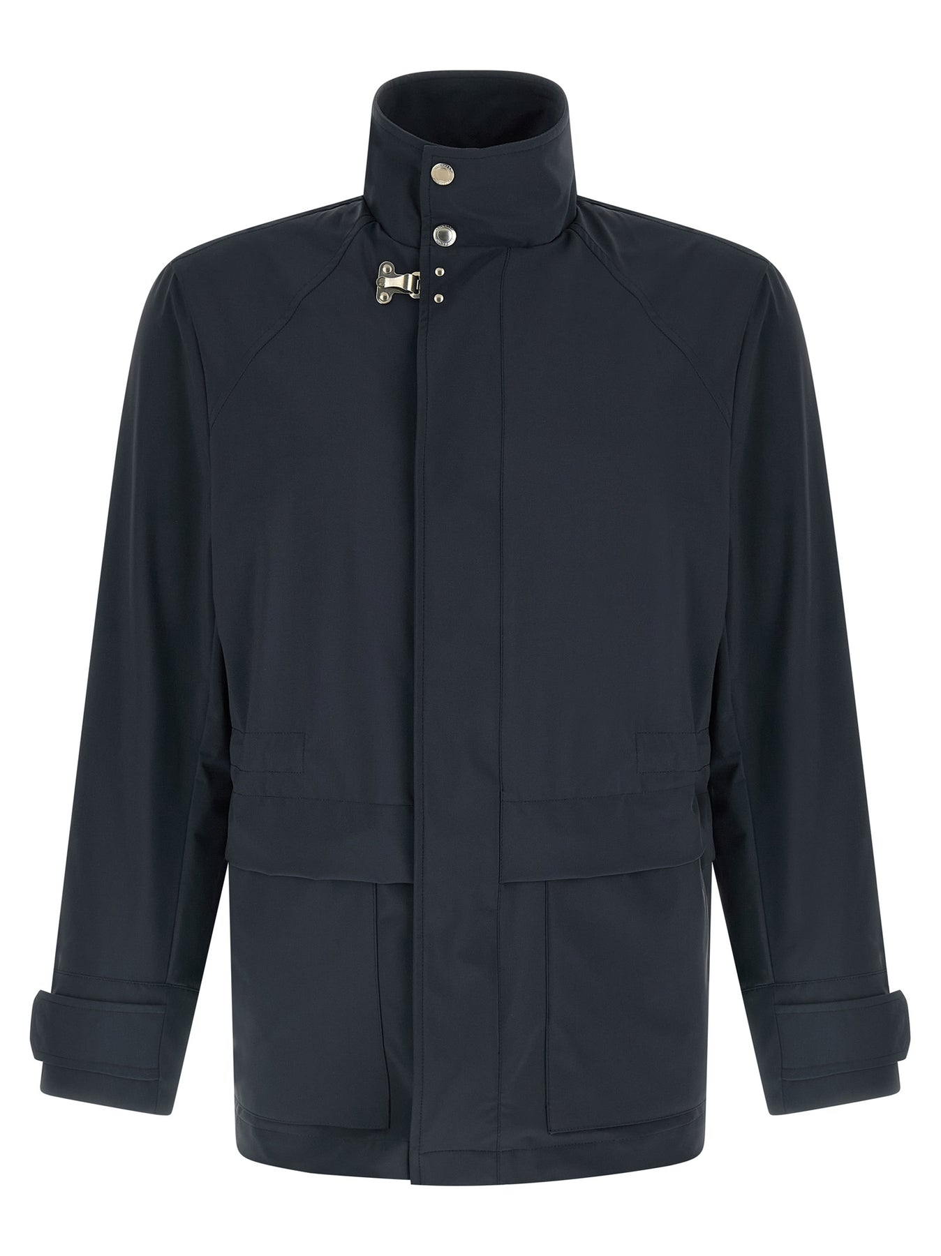 Windbreaker in waterproof technical fabric with lining, high neck, front zip and snap button closure, pockets, drawstring at the waist, long sleeves with cuffs, back slits with snap buttons.