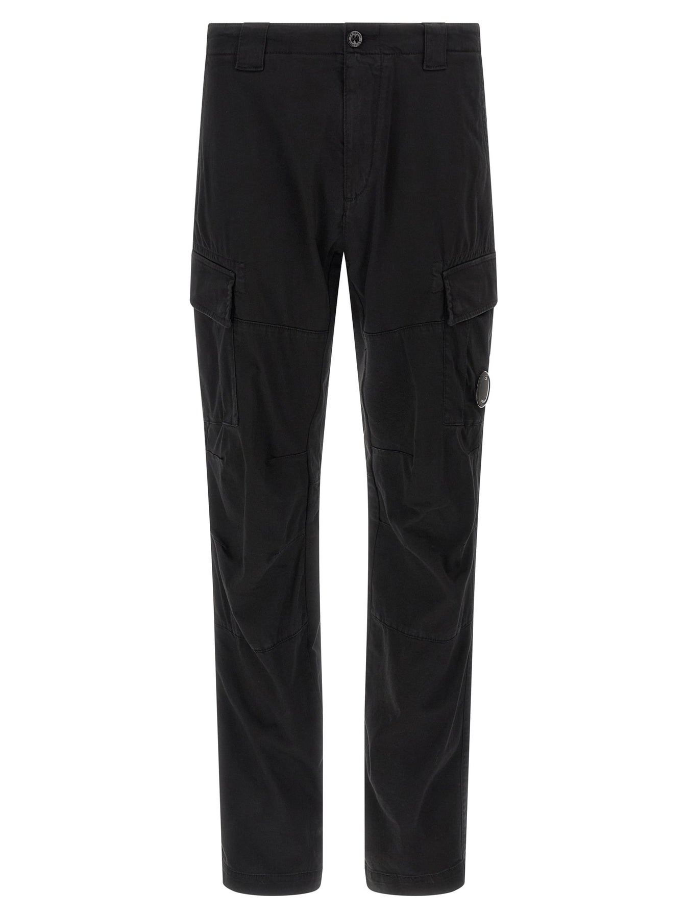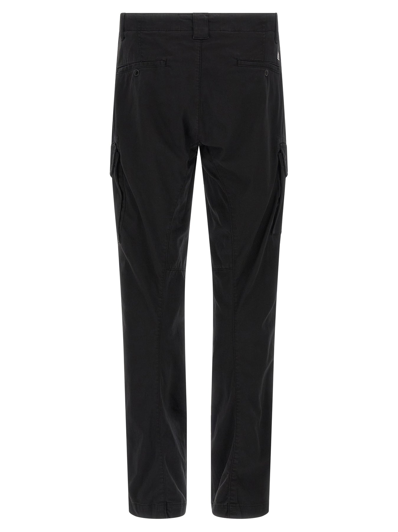 Garment-dyed sanded stretch cotton satin trousers, cargo model with side lens, zip and front button closure, pockets.