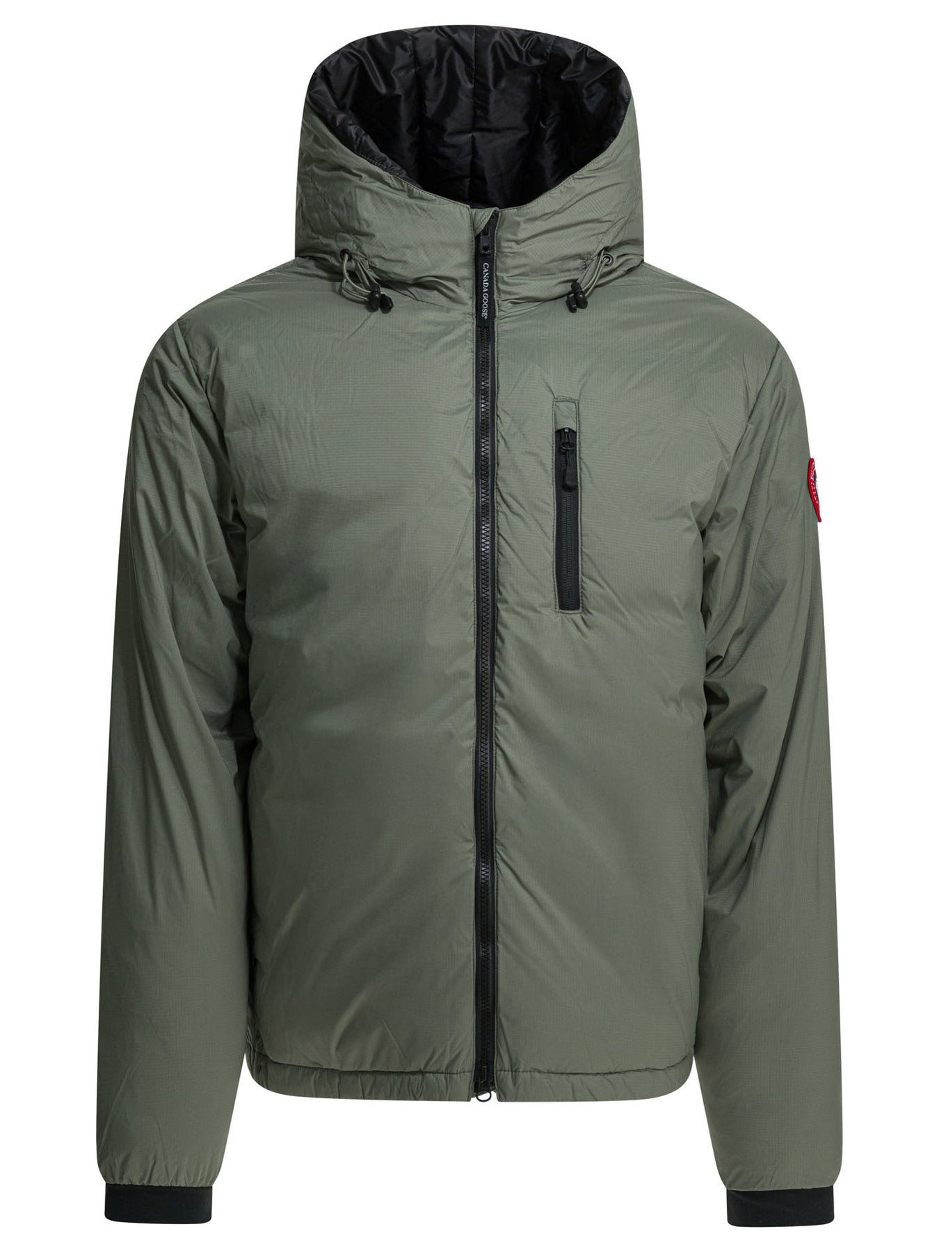 Canada Goose "Lodge" short down jacket constructed of 100% nylon Feather-Light Ripstop fabric designed to provide thermal insulation and light weight. The construction features a compact silhouette, adjustable padded hood and two-way zipper closure protected by windproof flap. The design features quilted panels, slightly extended back hem with internal drawcord and weather-resistant trim. The garment folds into the inside pocket for easy transport. || - Canada Goose logo applied - Long sleeves - Adjustable, padded hood - Quilted panels - Three exterior zippered pockets - Two inside pockets, one of which is mesh - Power Stretch® cuffs - Adjustable asymmetric hem with drawstring - Goose down as padding - Water-repellent, windproof, durable fabric - Withstands temperatures from 0°C to -15°C - Folds into right inside pocket - Two-way zipper closure with inside flap - Regular fit