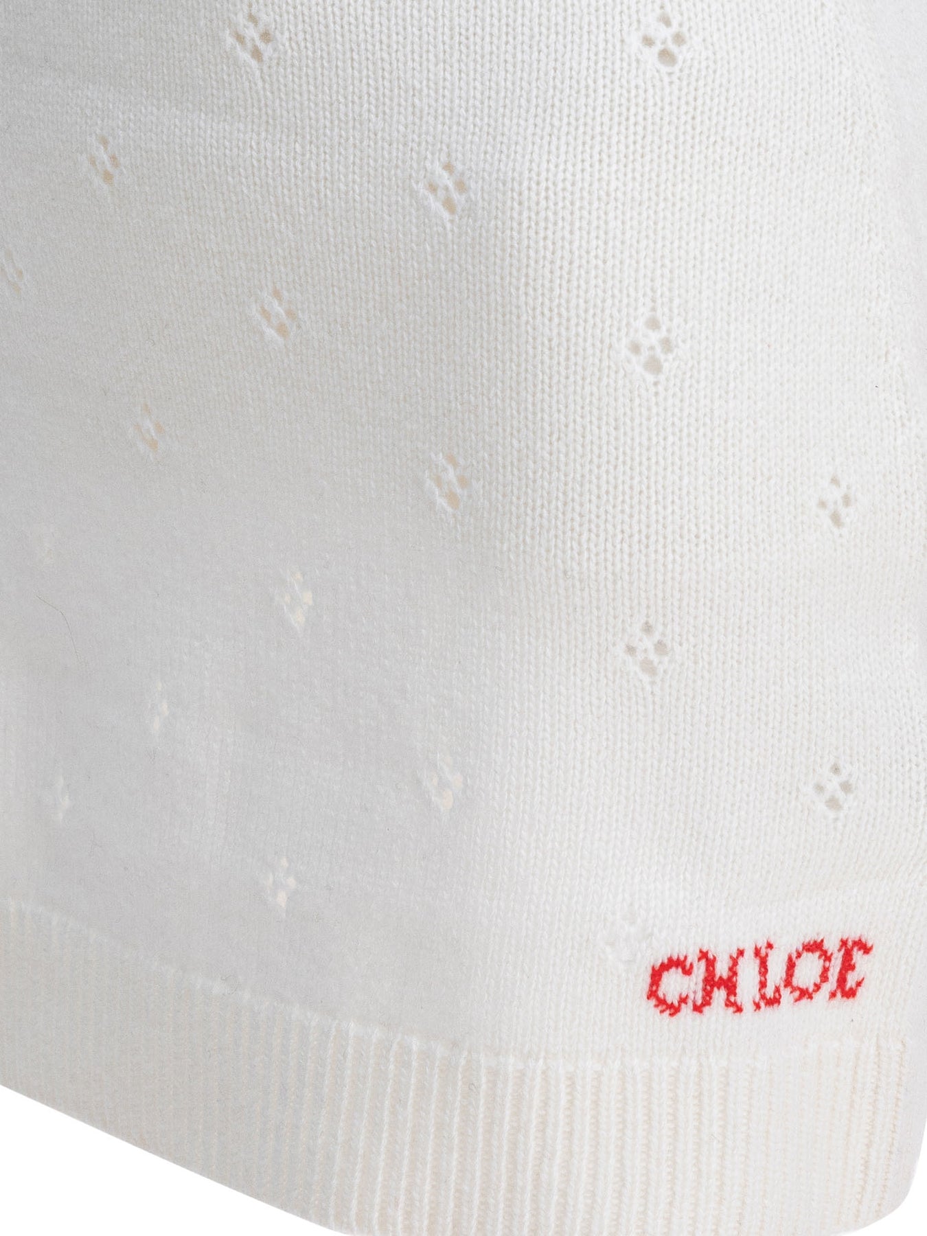 Chloé openwork wool and cashmere miniskirt, thick knit construction with openwork pattern distributed throughout. Fitted structure, wavy waist and ribbed finished edges. Mini length emphasizes the silhouette. Chloé logo embroidered at hem, brand-identifying detail. The composition incorporates wool from sources with less environmental impact, obtained with attention to animal welfare and the protection of biodiversity. || - Solid color - Pencil skirt - All-over perforated pattern - Ribbed edges - Chloé logo embroidered at hemline - Eco-friendly product - Slim fit