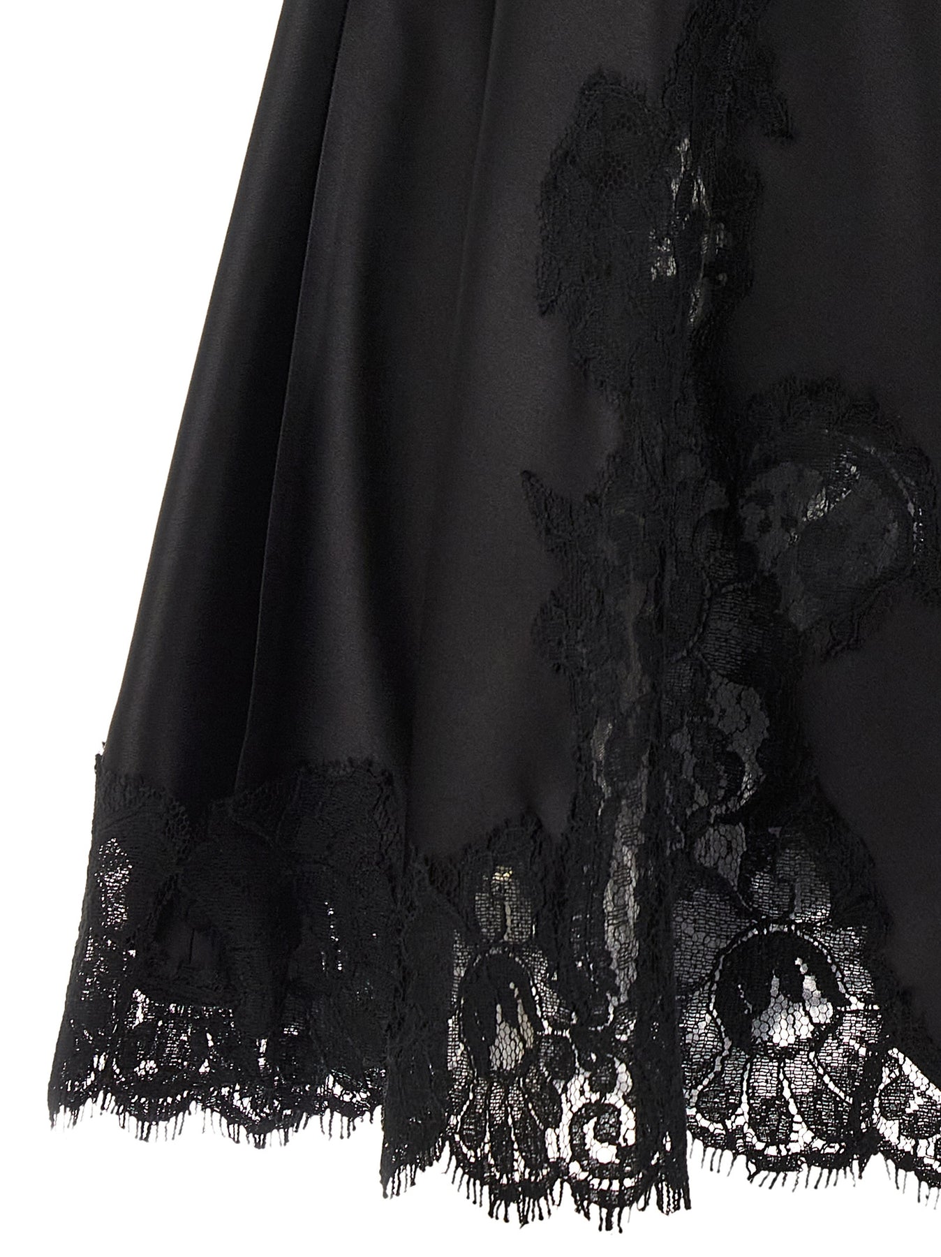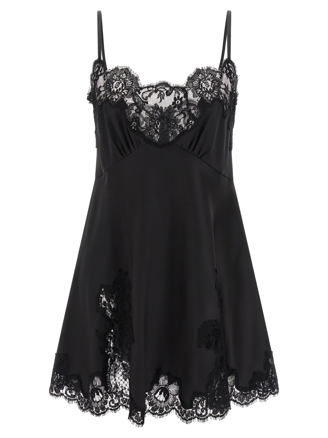 Stretch satin minidress with lace details, petticoat, flared silhouette, thin straps, sleeveless, V-neck, back zip closure.
