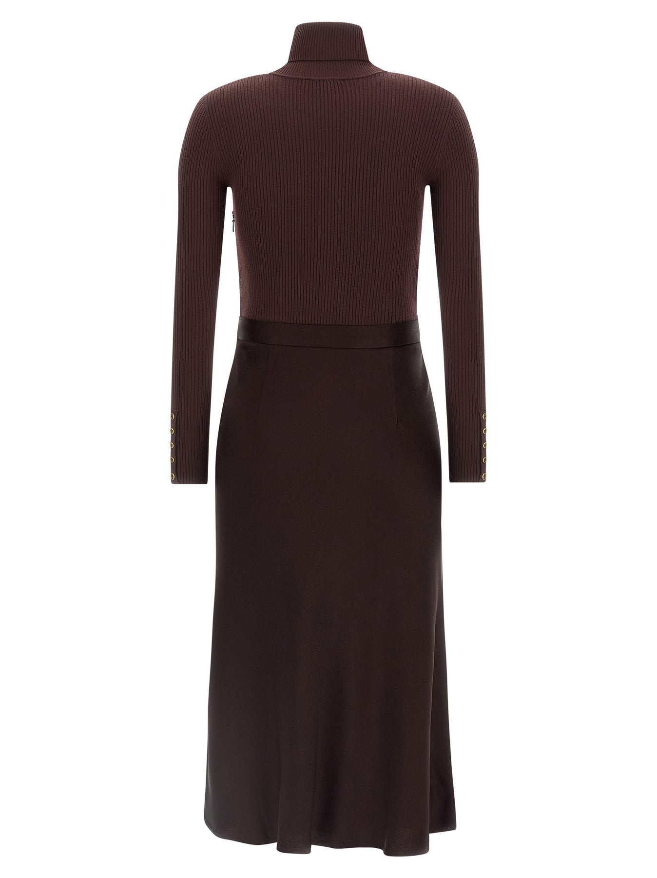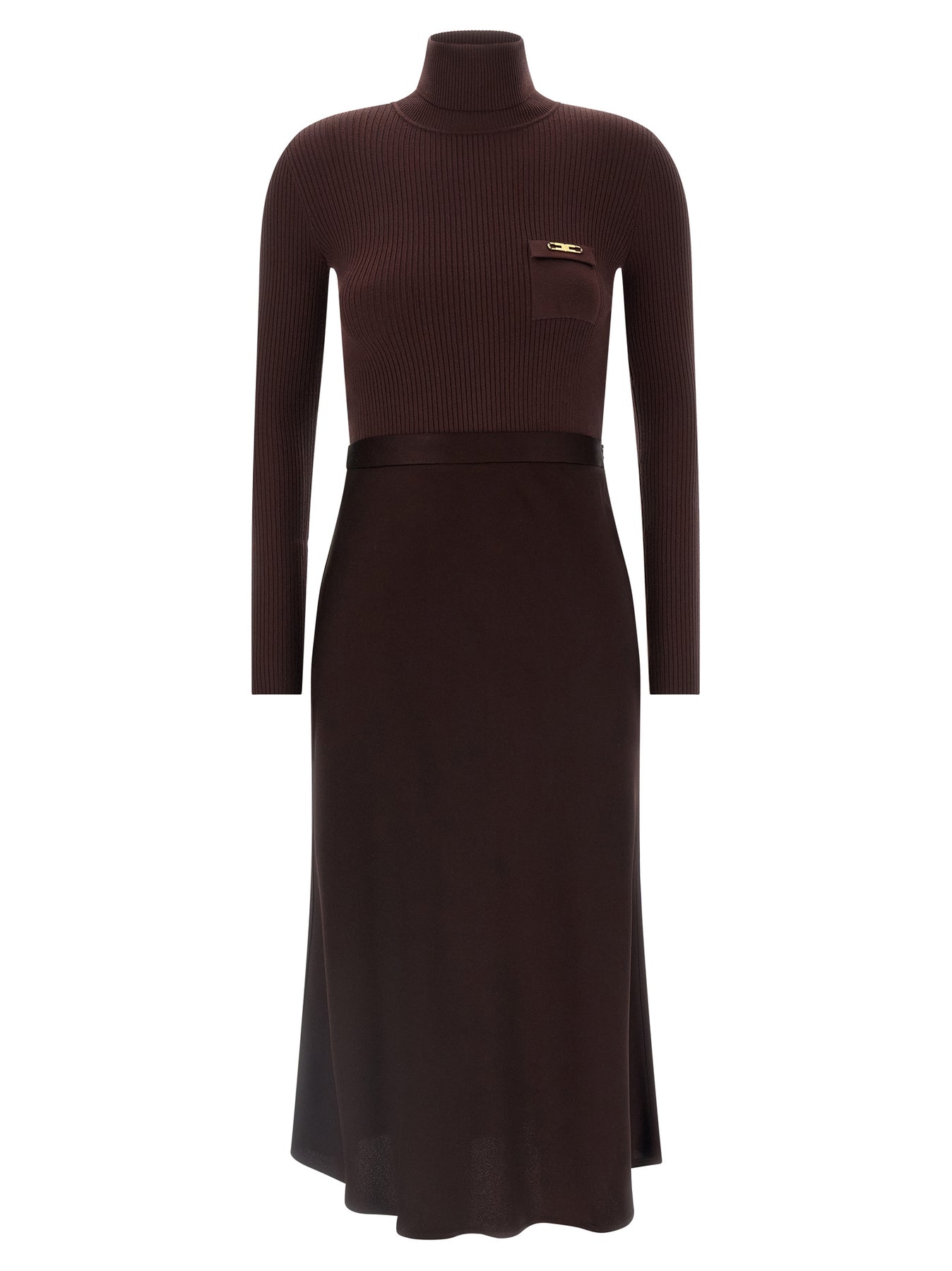 Midi dress consisting of ribbed stretch knit top, turtleneck turtleneck, pocket with gold metal logo, long sleeves and flared satin longuette skirt.