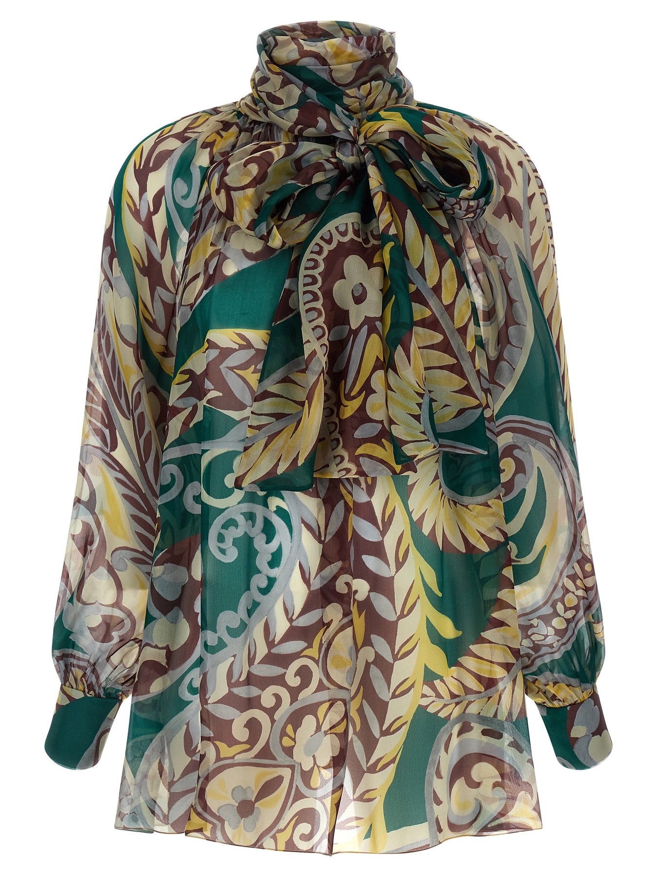 All-over Paisley print washed silk organza blouse, lavallière high neck with back button closure, teardrop cut-out detail, and long raglan sleeves with cuffs.