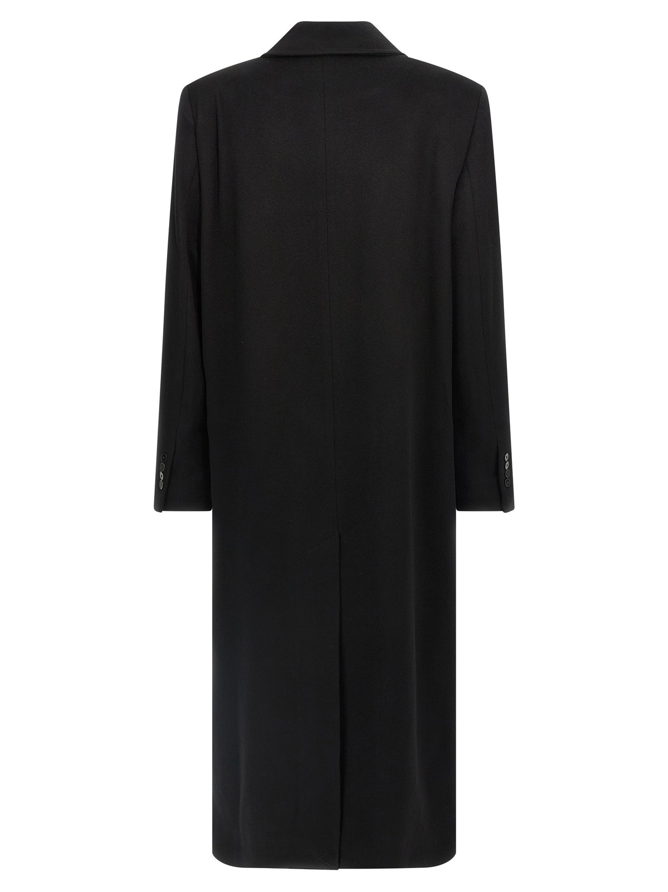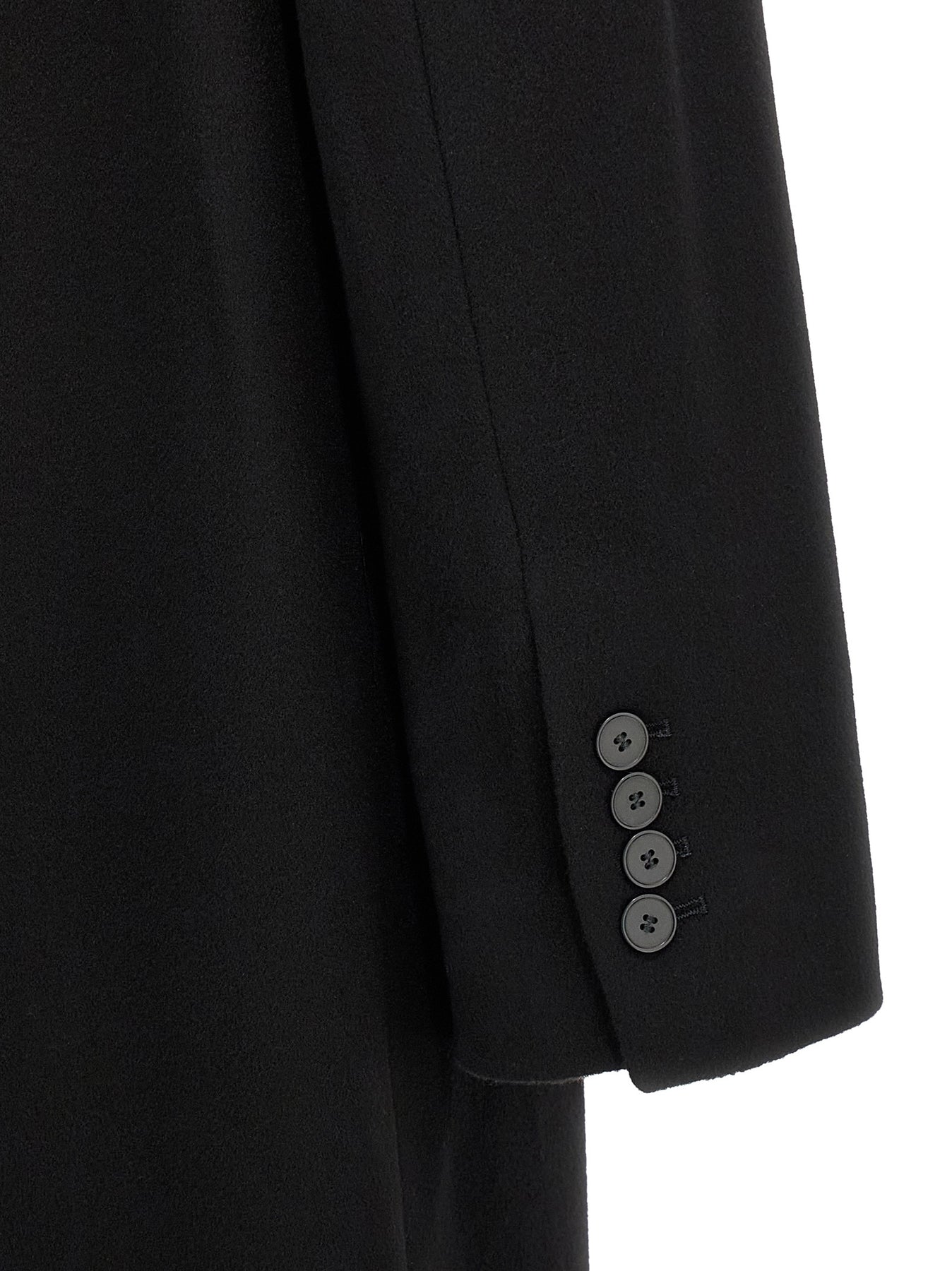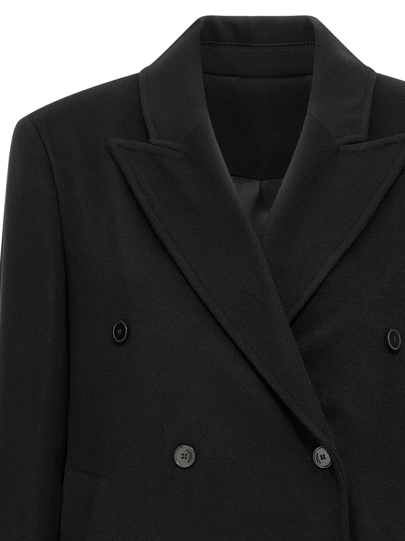 'Rosco' double-breasted coat in wool and cashmere drape with front button closure, peak lapels, pockets, long sleeves, structured shoulder strap, back split, lining.