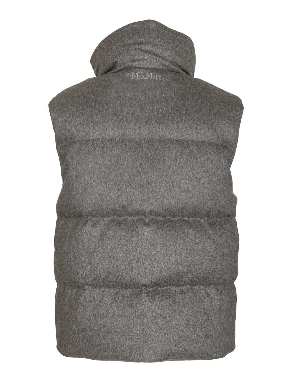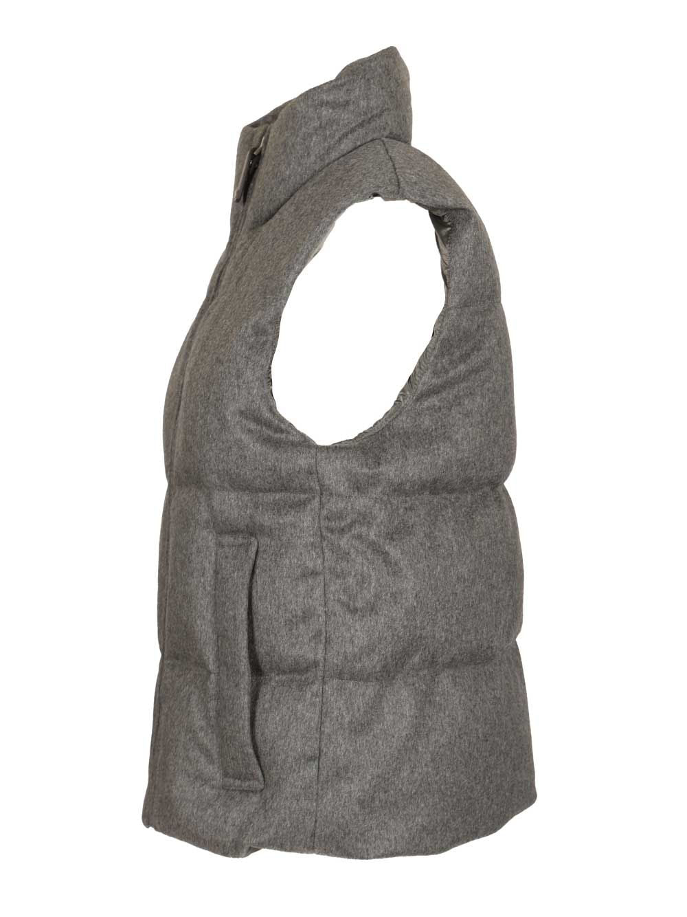 Vest in pure cashmere drap and iridescent, water-repellent canvas. Straight fit with a quilted, horizontally striped pattern. High collar. Front closure with metal zip and leather pull. Welt pockets on the sides.