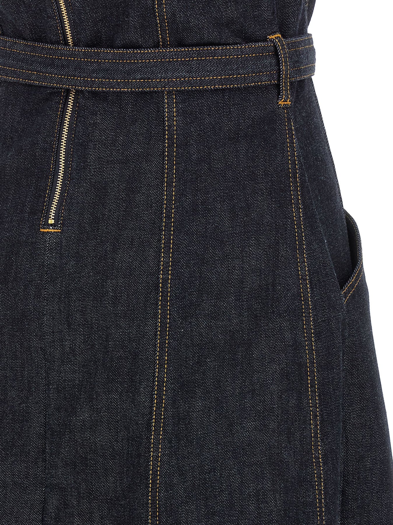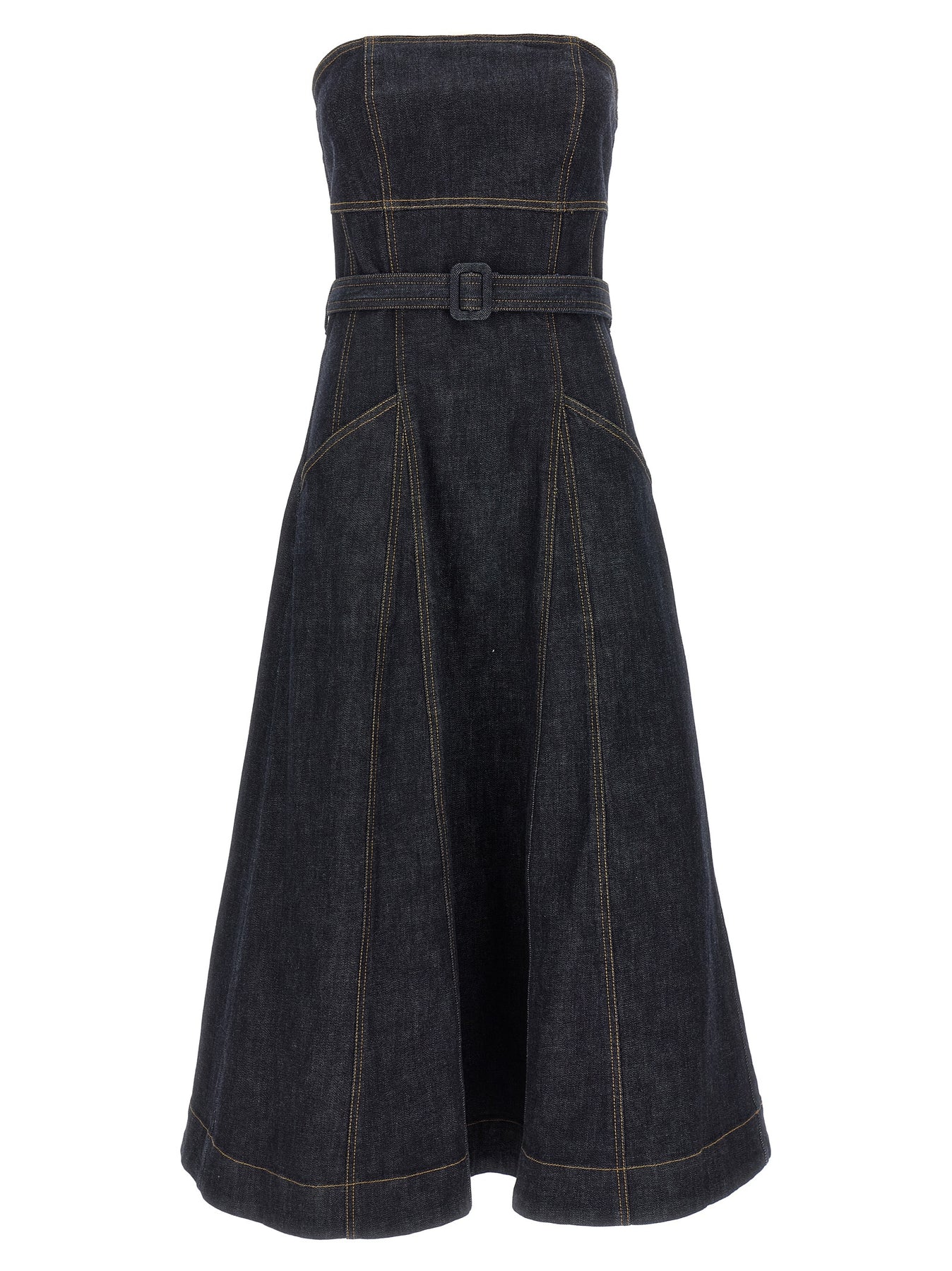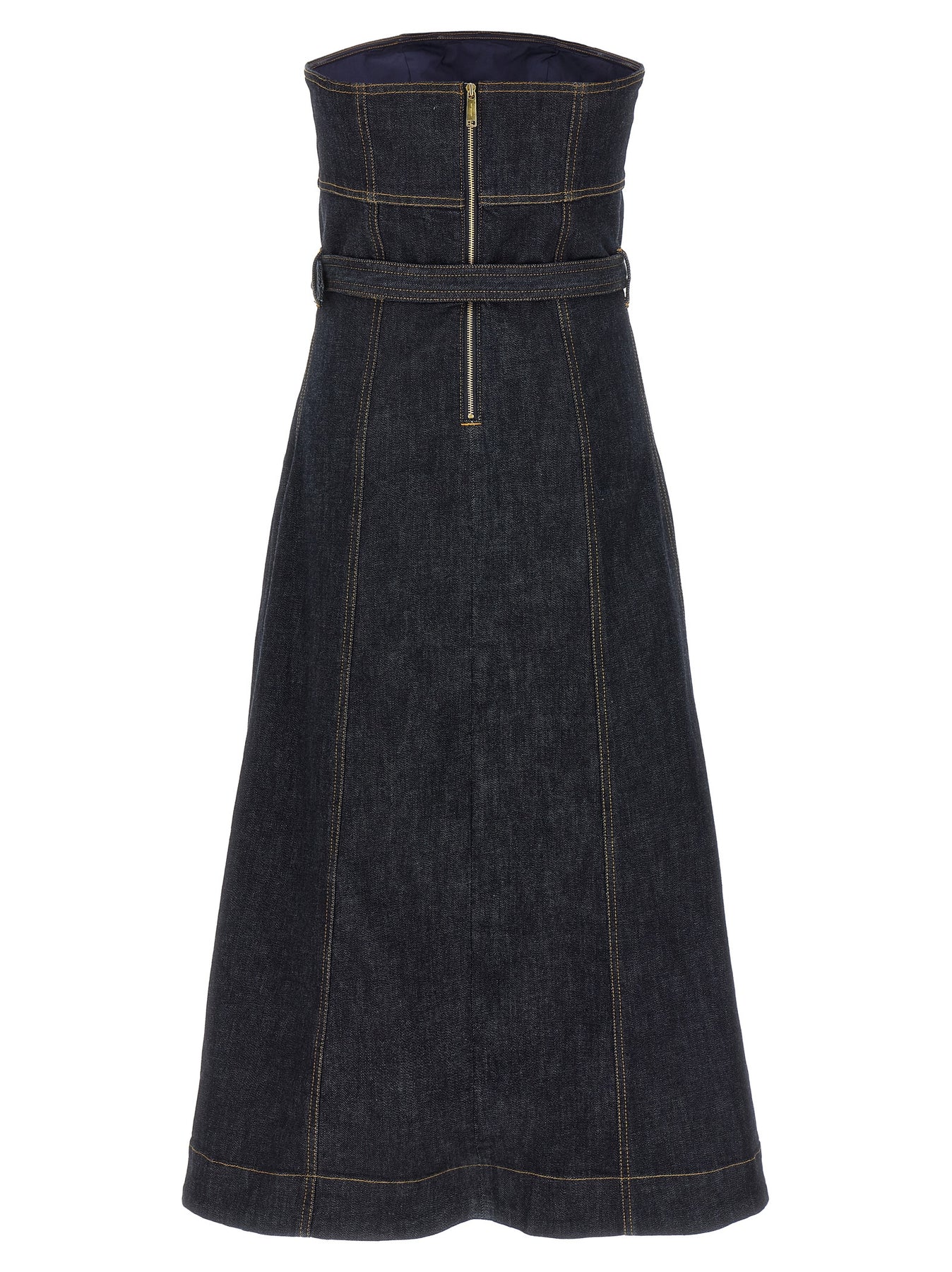 Off-the-shoulder 'Indigo Denim Bandeau Midi Dress' cotton denim dress with contrast stitching, inner corset with back hook closure, flared skirt, pockets, back zip closure, removable matching belt.