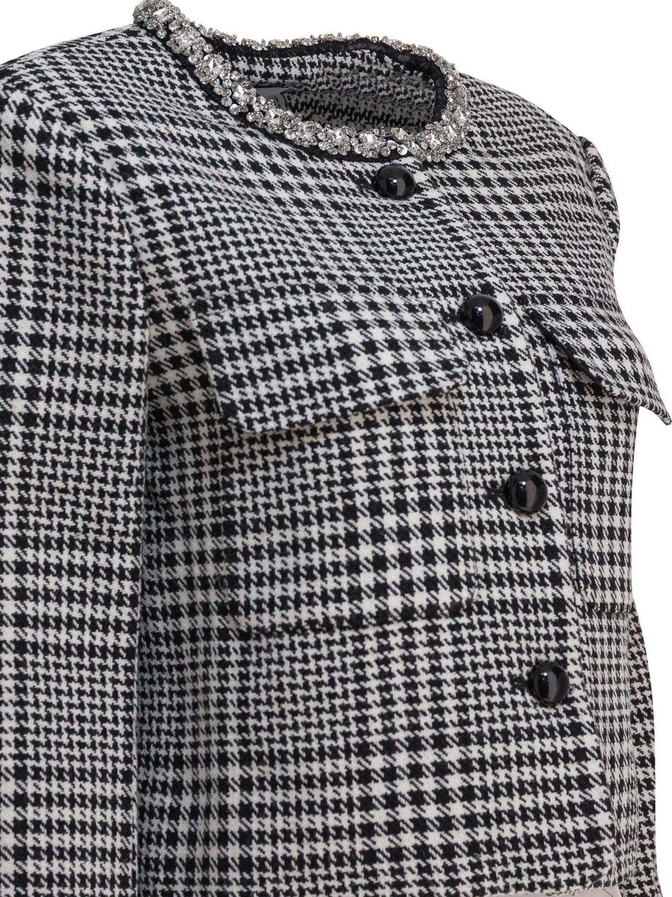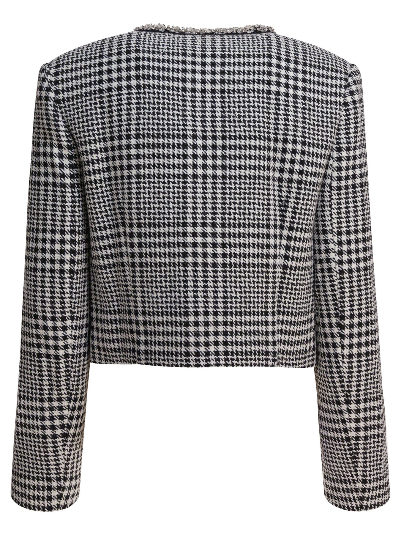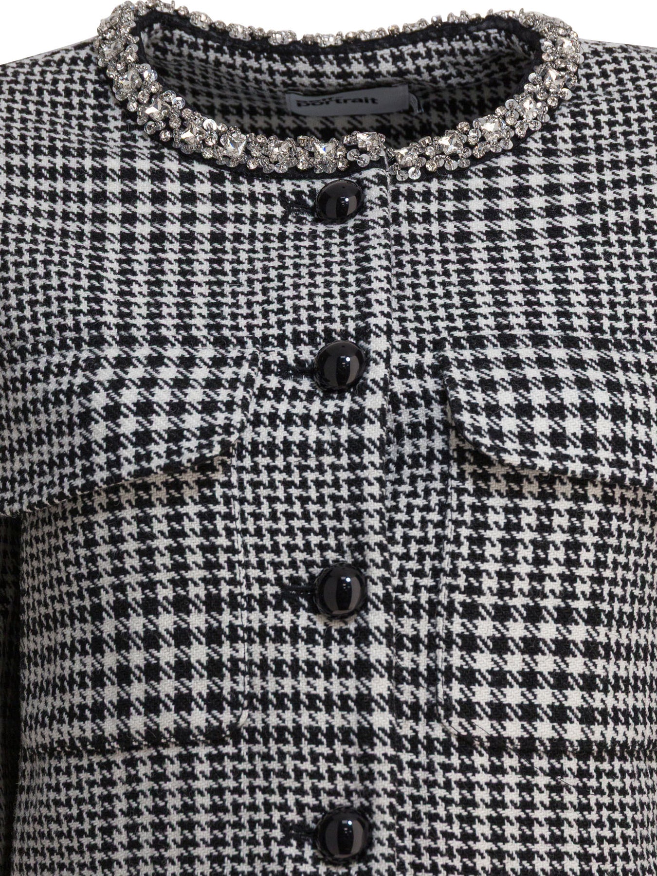 Self-portrait houndstooth blazer with tailored construction, made of wool-blend fabric with houndstooth pattern. The design features a fitted silhouette with a front button closure. The garment includes applique rhinestone details, functional pockets and a minimal stretch construction that retains shape. The rigid construction enhances the sharp shoulder cut and fabric finish. || - Prince of Wales - Applied rhinestone details - Front button closure - Functional pockets integrated into the structure - Boxy fit