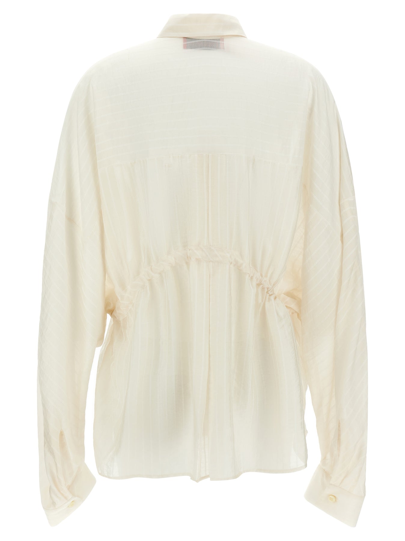'Dalida' shirt in semi-transparent muslin with striped pattern, front mother-of-pearl button closure, drawstring at the waist, long wide sleeves with cuffs and dropped shoulder, asymmetrical hem.