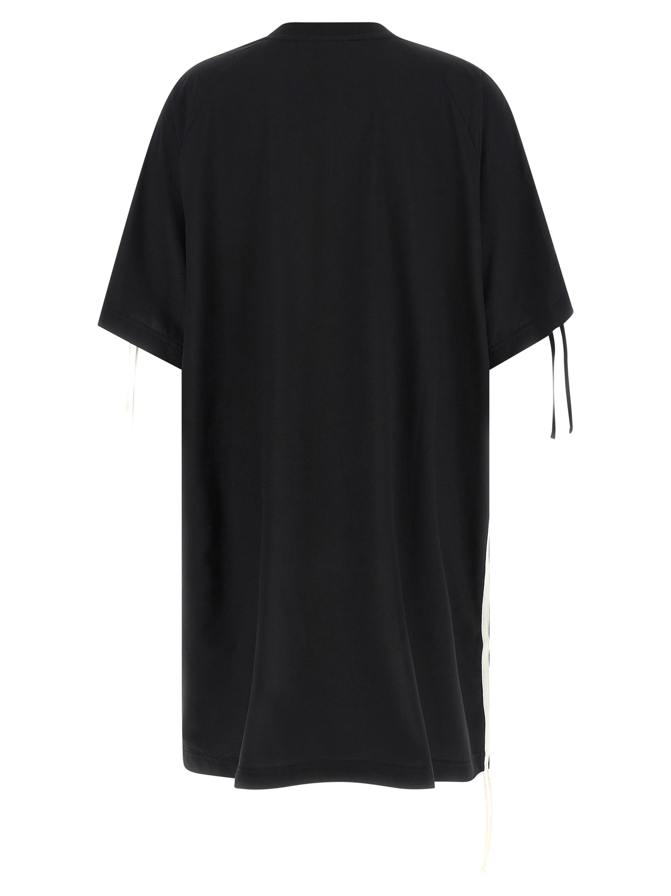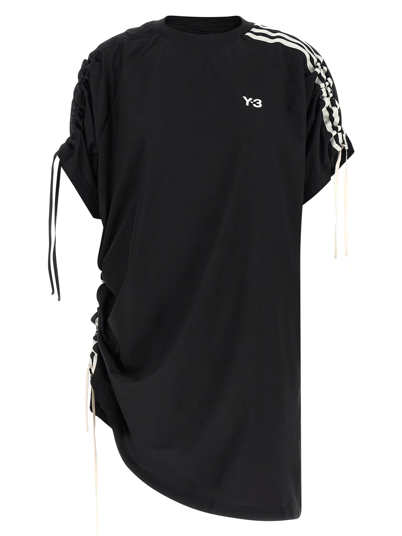 Mini dress in breathable technical fabric, t-shirt with contrasting '3 Stripes' and tone on tone, front embossed vinyl logo, drawstring on sleeves and side hem to adjust its length, crew neck, short sleeves.