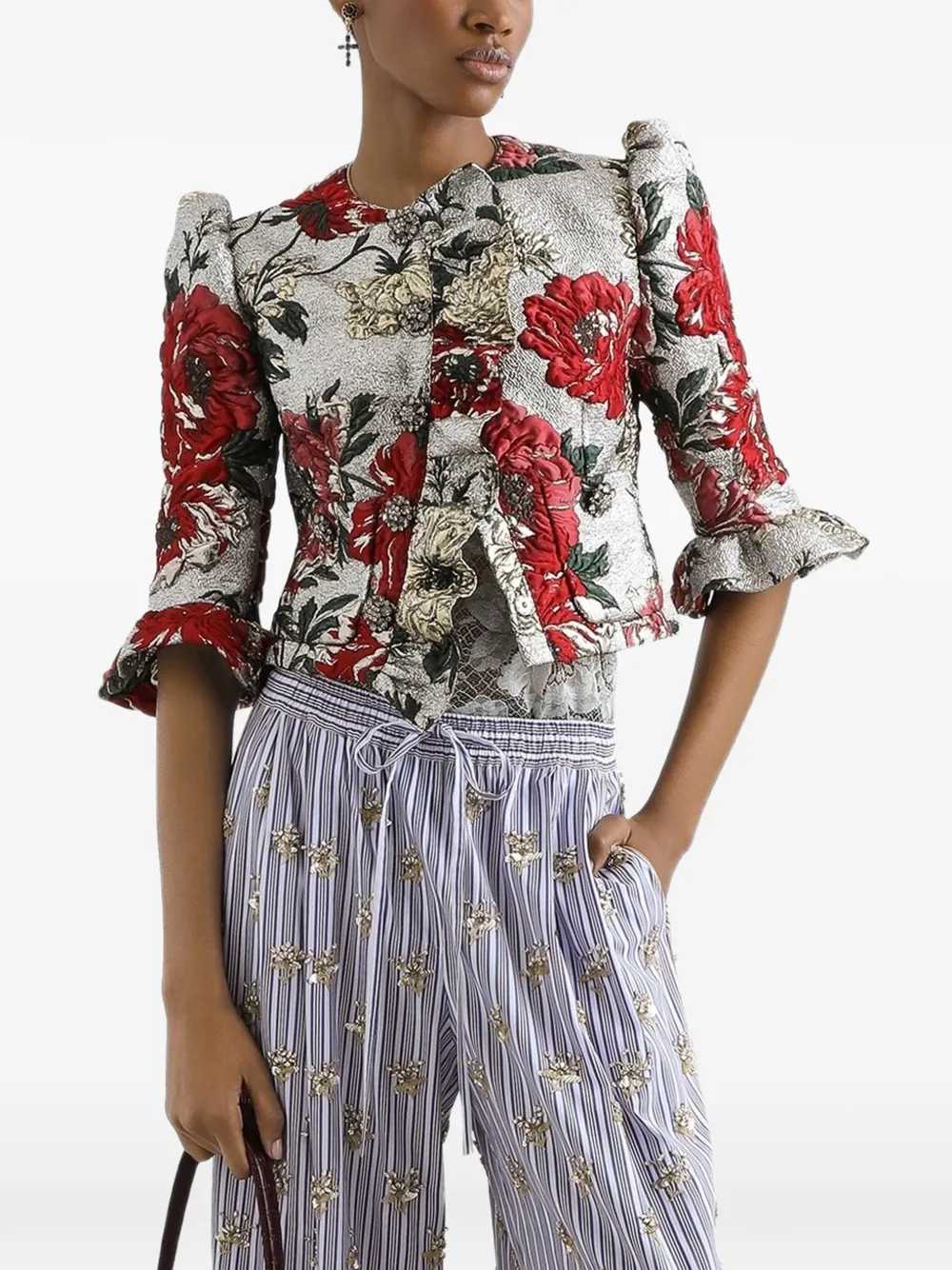 Jacket with floral embroidery Features Silver Jacquard Floral embroidery Button closure Ruffled cuffs Padded shoulders Cropped design Origin: Italy Composition Outer fabric: 83% polyester, 10% silk, 7% polyamide Lining: 83% polyester, 10% silk, 3% elastane Washing instructions Read the manufacturer`s instructions ID F27IZZHJMRI