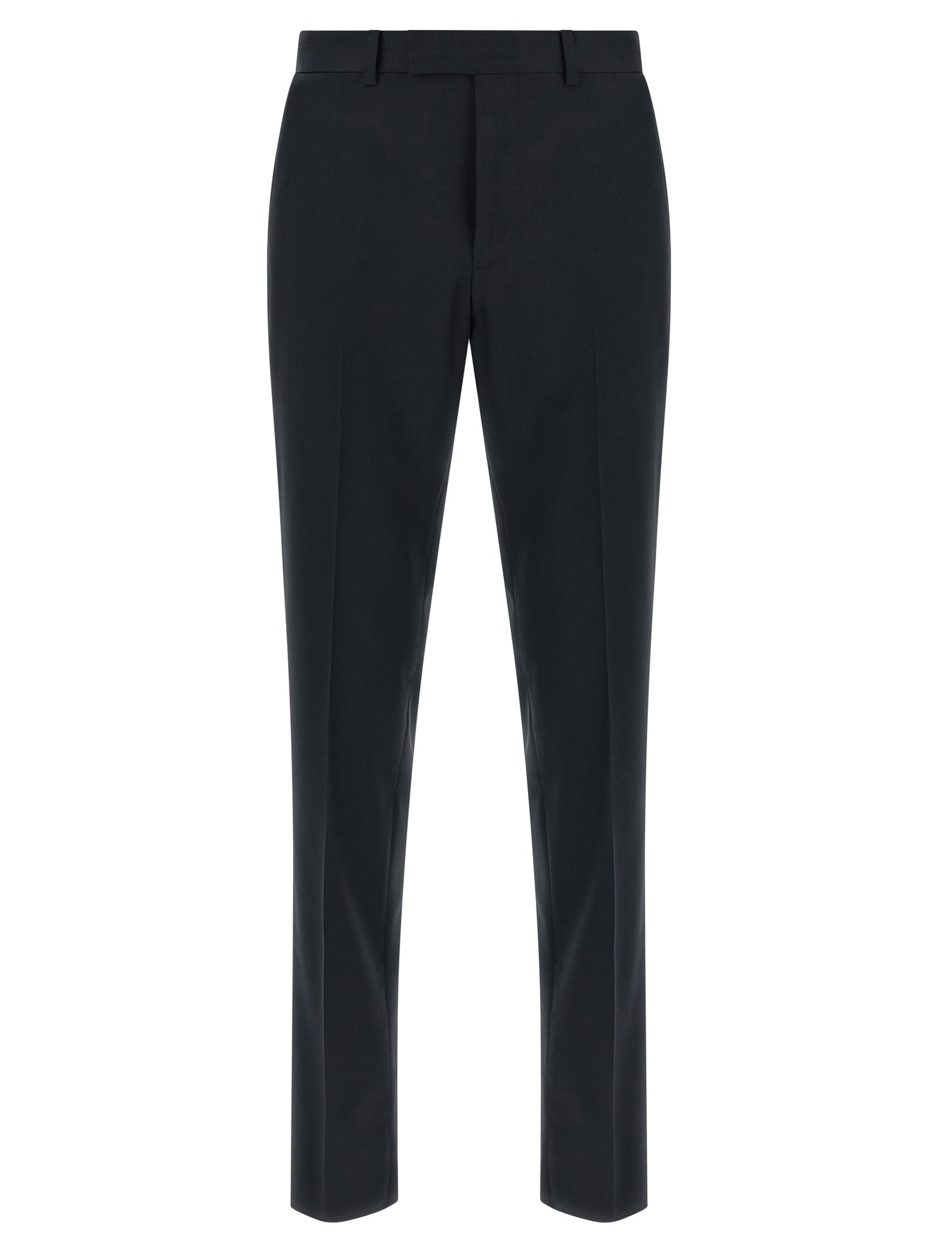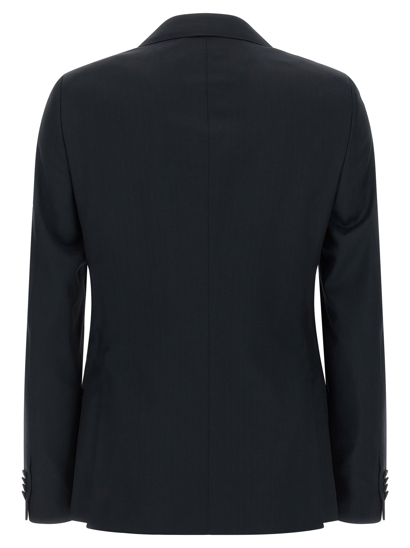 Cool tone-on-tone pinstriped wool dress consisting of single-breasted blazer with front button closure, mirror lapels, chest pocket, flap pockets, viscose lining, two inner pockets, buttonhole cuffs, back slits and stretched pleat trousers, front 'americane' pockets, back welt pockets, front zip and button closure, viscose lining.