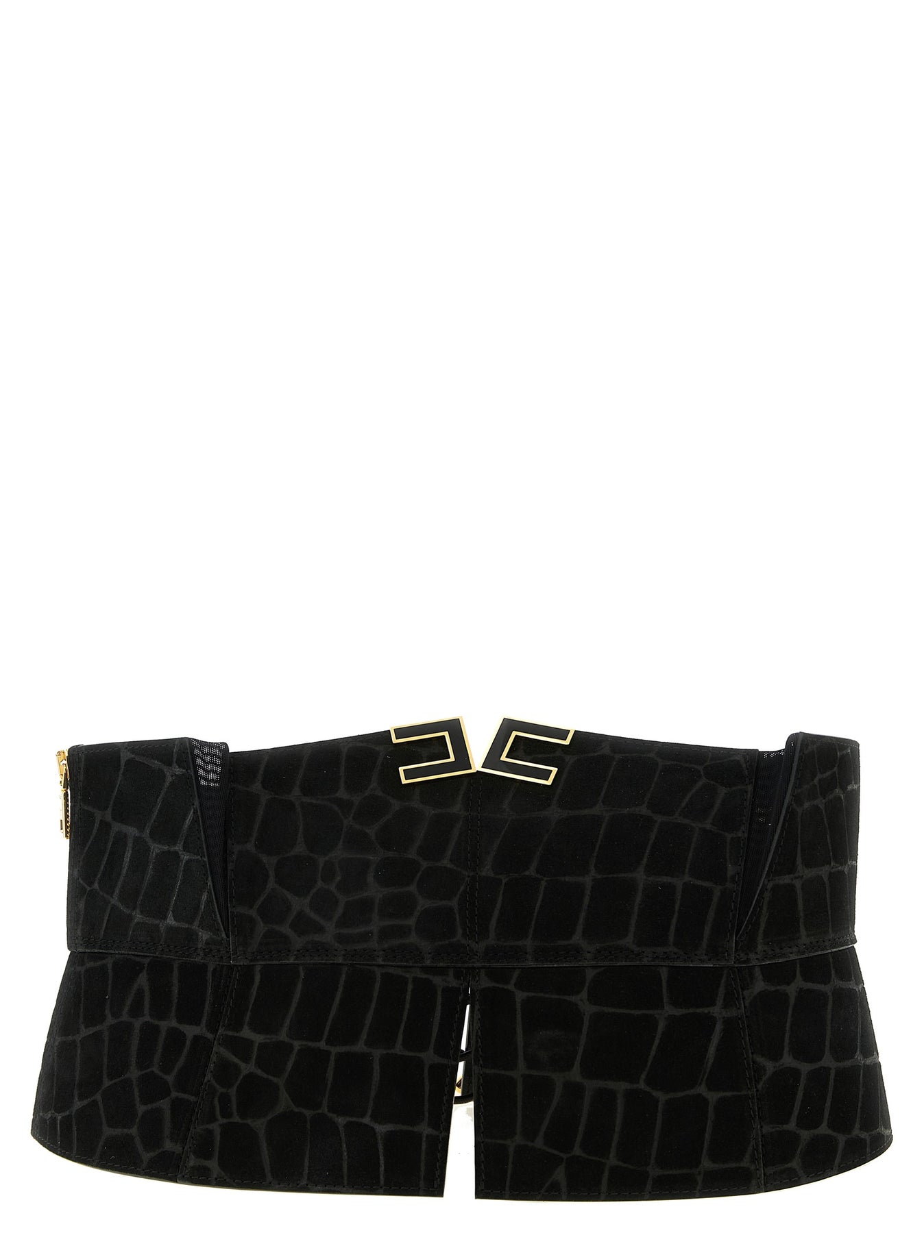 Coconut-effect nubuck leather belt with cut-out and semi-transparent tulle inserts, front enamelled metal logo, adjustable criss-cross laces at the back.