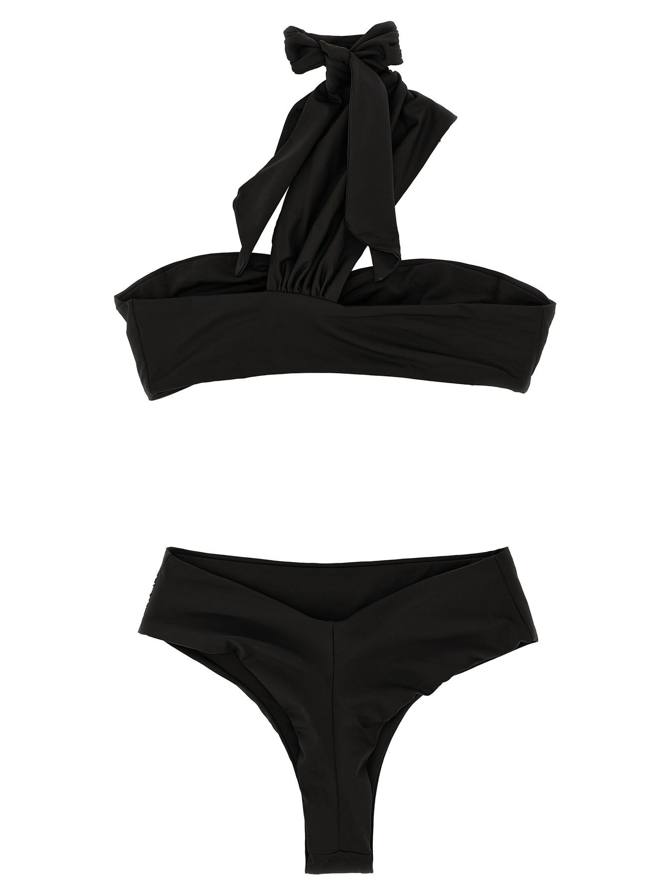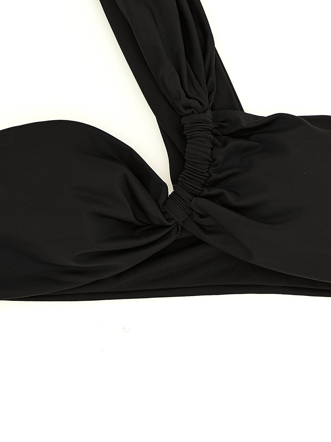 Lycra bikini, one-shoulder top with crossed band on the breast, tie to tie behind the neck with metal jewel detail with hammered texture, high waist bottoms.