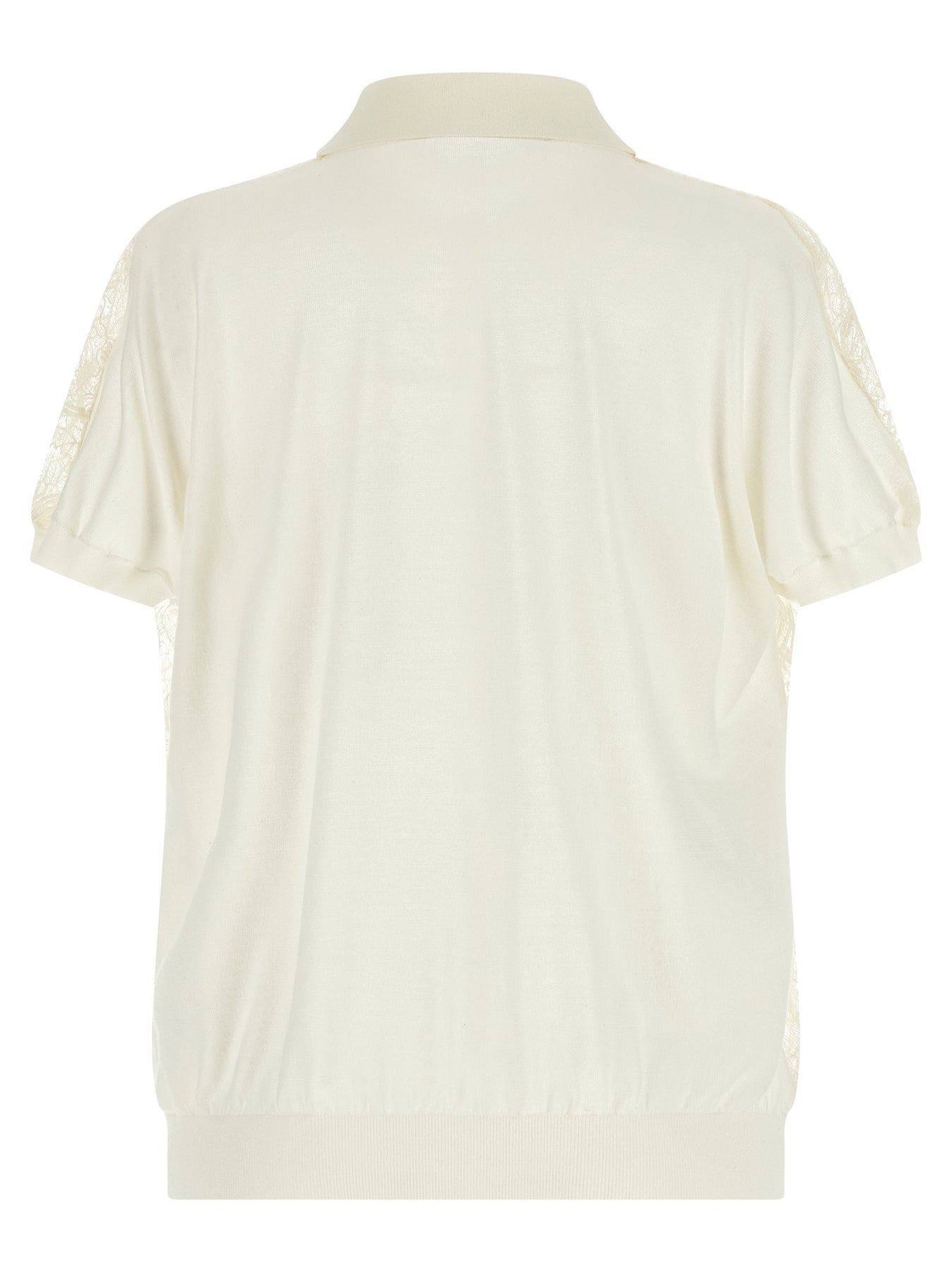 Silk and cotton blend cardigan with semi-transparent organza lace front, shirt collar, front hidden snap button closure, short cuffed sleeves, and headband on the hem.