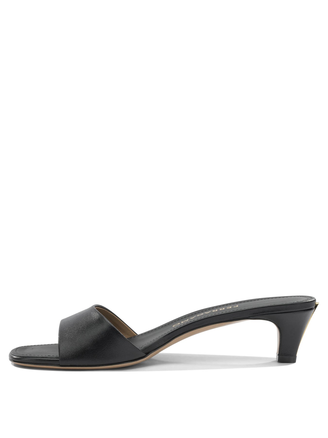 Ferragamo "Tatiana 40MM" mules made of smooth leather with a soft finish. The structure features a wide front band that wraps around the foot, ensuring stability while wearing. The silhouette features a tapered silhouette and a slightly rounded toe. The sole accompanies the sleek shape of the shoe. The open-back design is complemented by a slim medium heel that is slightly flared downward. || - Smooth leather with a soft finish - Wide, wrap-around front band - Slightly rounded toe - Slim, slightly flared low heel - Leather insole with gold-tone Ferragamo logo - Open-back style
