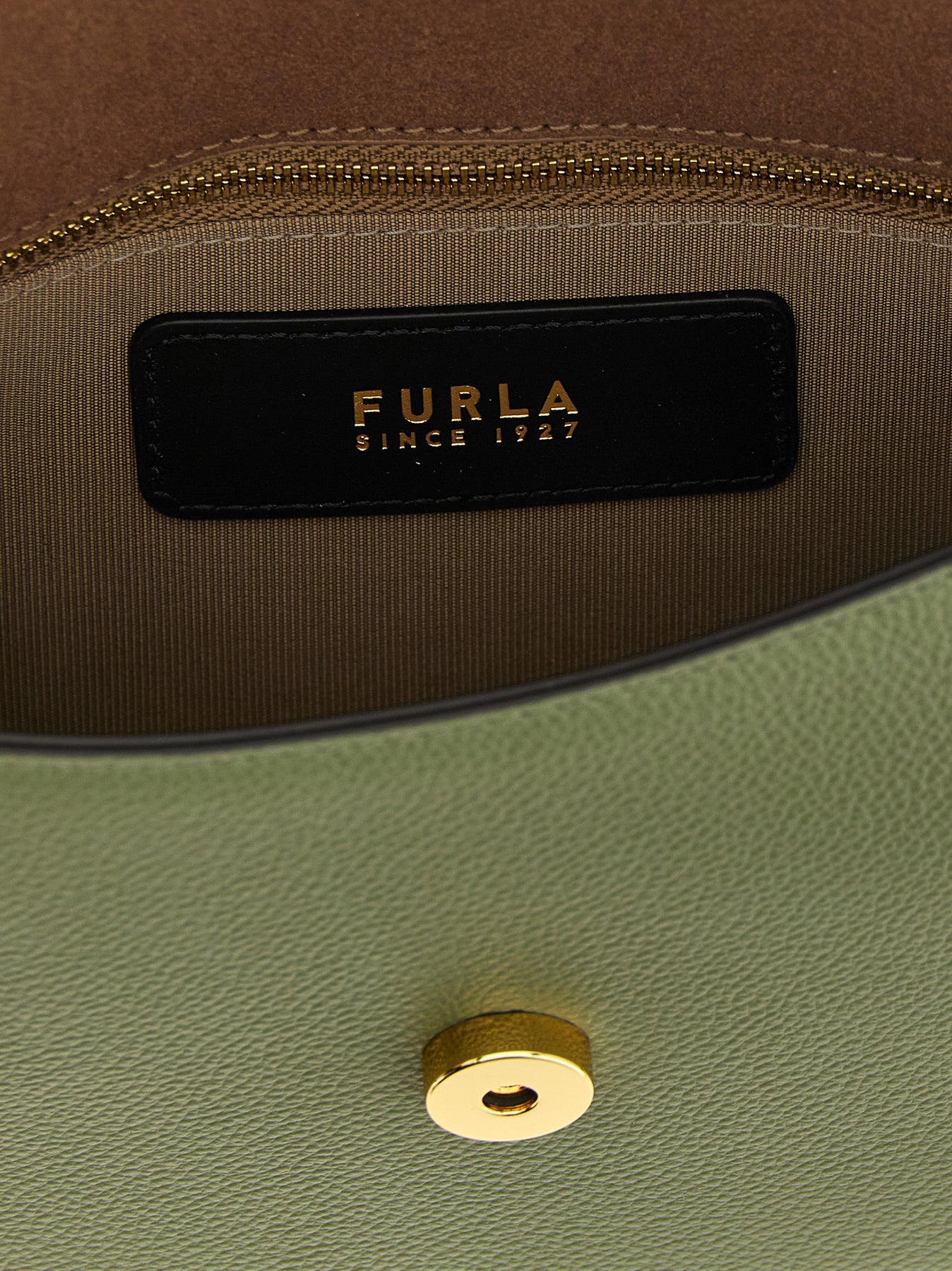 Small fine leather 'Furla Moonlight' crossbody bag with a light hammered finish, magnetic flap closure with iconic metal 'Sfera' logo on the front, embossed logo on the back, and adjustable shoulder strap.