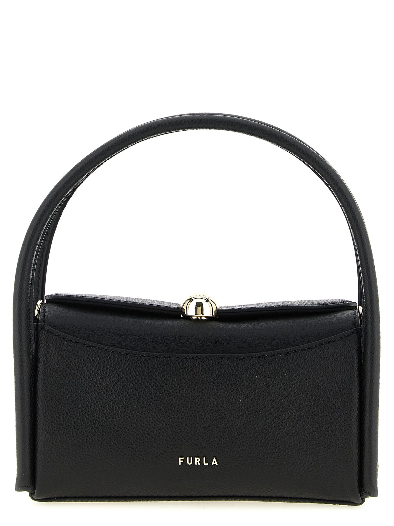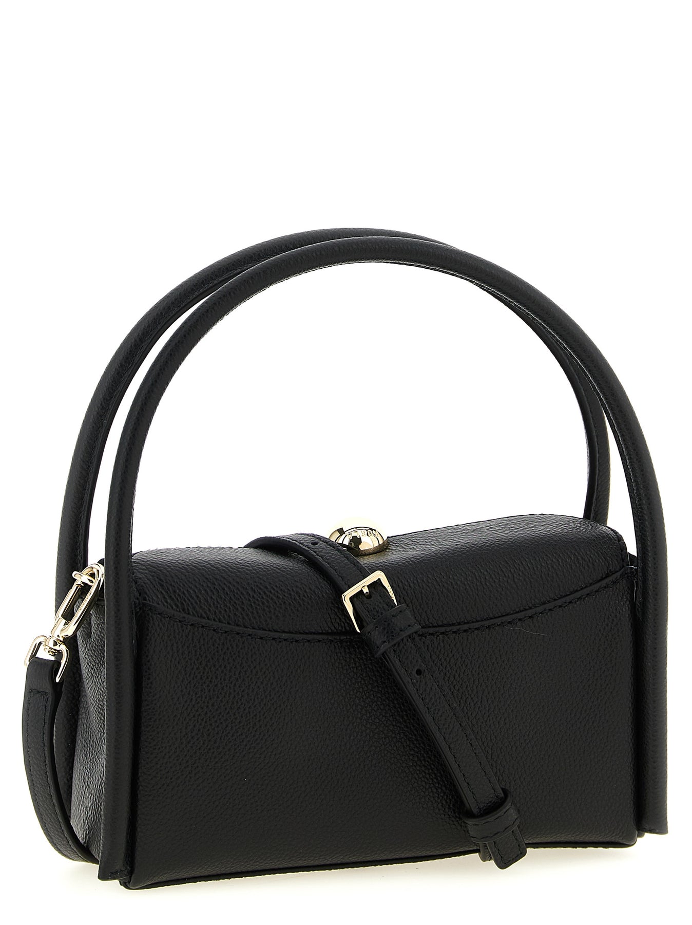 Boston Nicole' mini handbag in grain-effect print leather with double fixed handle, magnetic flap closure, front metal lettering logo, and adjustable and removable shoulder strap.
