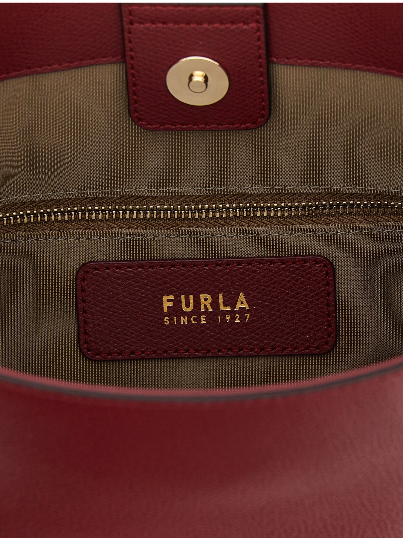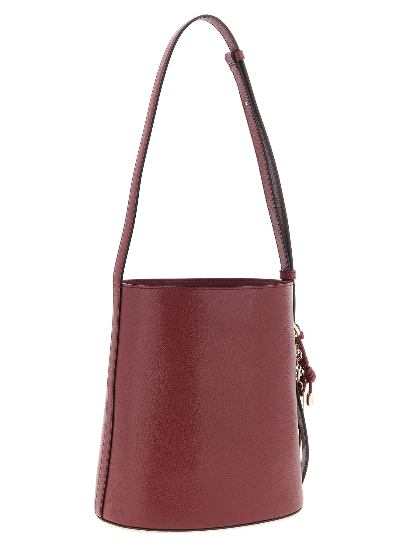 Small 'Roxie' bucket bag in leather with grain effect print, front metal lettering logo, internal magnetic closure, flexible bottom, adjustable shoulder strap, removable charm.