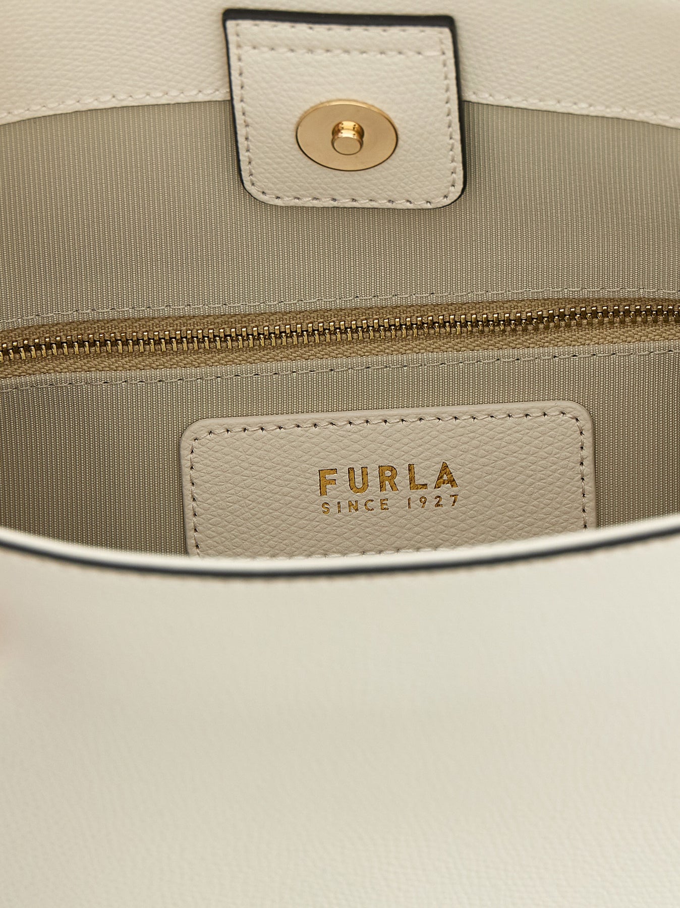 Small 'Roxie' bucket bag in leather with grain effect print, front metal lettering logo, internal magnetic closure, flexible bottom, adjustable shoulder strap, removable charm.
