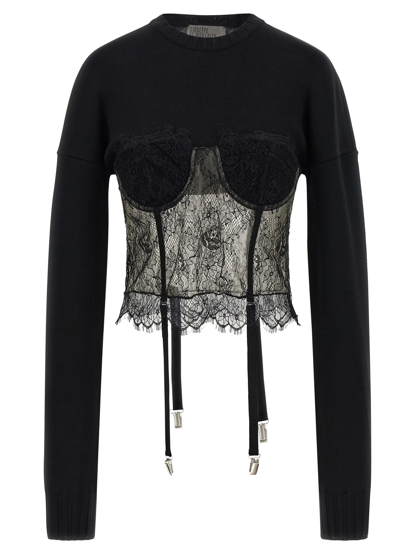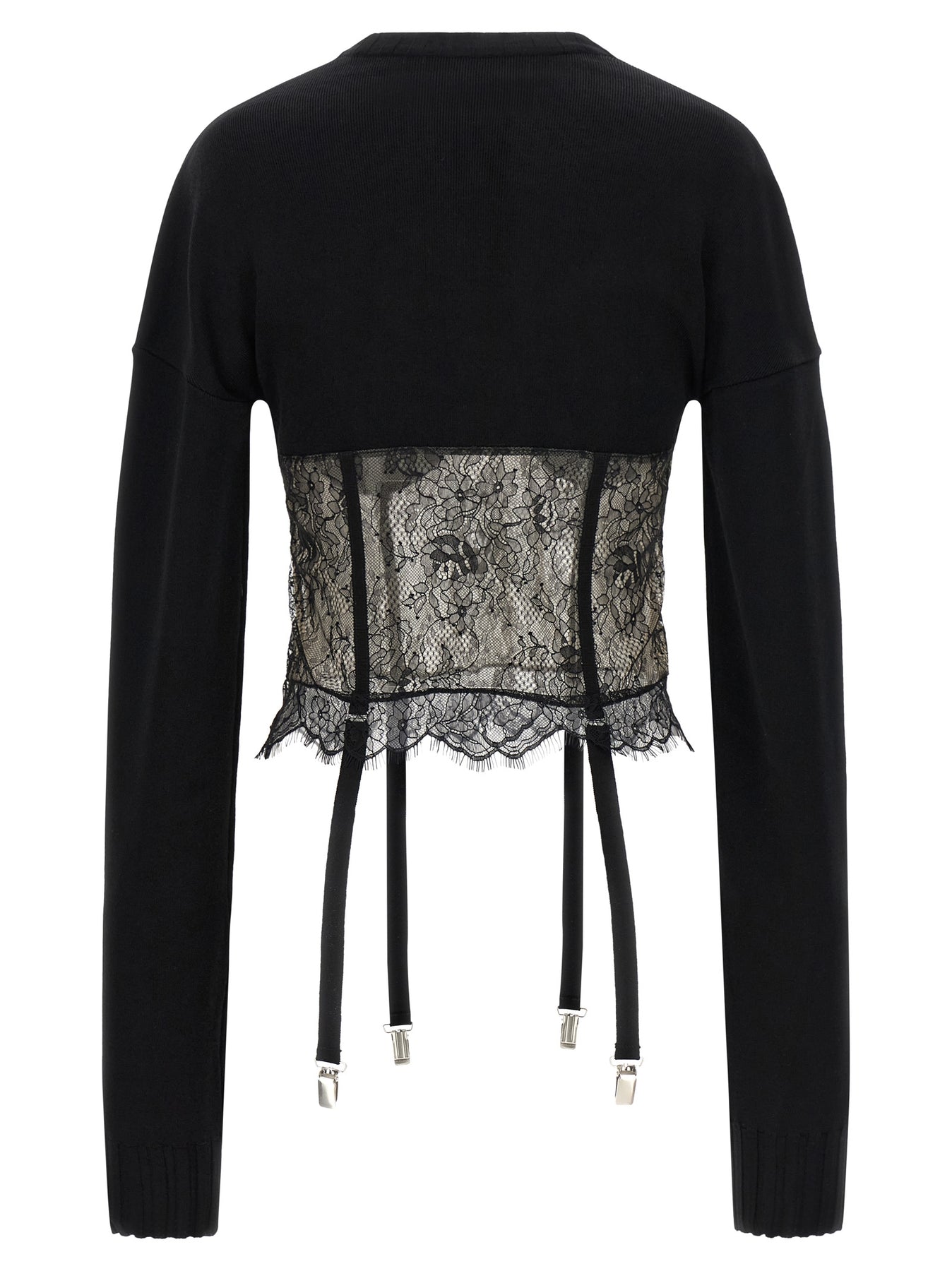 Stretch viscose blend sweater, tone-on-tone semi-transparent lace insert at the bottom with removable garter detail, preformed cups with cues, crew neck, long sleeves with cuffs and dropped shoulder.